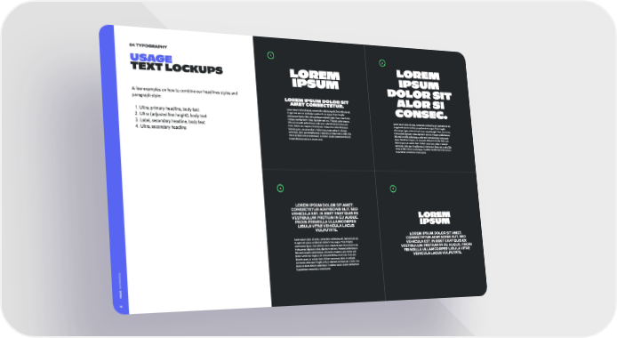 04 typography 1 2 Usage Lorem Lorem text lockups ipsum ipsum dolor sit A few examples on how to combine our headlines styles and Lorem ipsum dolor sit alor si paragraph style. amet consectetur. Lorem ipsum dolor sit amet, consectetur adipiscing elit. Sed vehicula est. consec. In eget erat quis ex vestibulum pretium in eu augue. Proin fringilla !' Ultra, primary headline, body tex5 ullamcorper ligula, vitae vehicula lacus vulputate eget. Nunc mauris dui, tristique sed dignissim vitae, dignissim sed orci. Praesent pellentesque, ' Ultra (adjusted line height), body tex5 Lorem ipsum dolor sit amet, consectetur adipiscing elit. Sed vehicula est. felis sed convallis pellentesque, odio erat v pharetra justo metus quis In eget erat quis ex vestibulum pretium in eu augue. Proin fringilla lorem. Morbi nec magna a mi venenatis finibus id ut nulla. Nulla quis ' Label, secondary headline, body tex5 ullamcorper ligula, vitae vehicula lacus vulputate eget. Nunc mauris dui, lobortis quam, at rutrum diam. Nullam accumsan, tellus in volutpat tristique sed dignissim vitae, dignissim sed orci. Praesent pellentesque, 8' Ultra, secondary headline commodo, dolor sem fringilla ante, in elementum libero est ut odio. Etia felis sed convallis pellentesque, odio erat v pharetra justo metus quis metus at diam dictum scelerisque. Curabitur iaculis viverra fermentum. lorem. Morbi nec magna a mi venenatis finibus id ut nulla. Nulla quis Suspendisse consectetur ornare justo. lobortis quam, at rutrum diam. Nullam accumsan, tellus in volutpat commodo, dolor sem fringilla ante, in elementum libero est ut odio. Etia metus at diam dictum scelerisque. Curabitur iaculis viverra fermentum. Suspendisse consectetur ornare justo. 3 4 Lorem ipsum dolor sit amet, consectetur adipiscing elit. Sed vehicula est. In eget erat quis ex Lorem vestibulum pretium in eu augue. Proin fringilla ullamcorper ipsum ligula vitae vehicula lacus vulputate. Lorem ipsum dolor sit amet, Lorem ipsum dolor sit amet, consectetur adipiscing elit. Sed vehicula est. consectetur adipiscing elit. Sed In eget erat quis ex vestibulum pretium in eu augue. Proin fringilla vehicula est. In eget erat quis ex ullamcorper ligula, vitae vehicula lacus vulputate eget. Nunc mauris dui, vestibulum pretium in eu augue. Proin tristique sed dignissim vitae, dignissim sed orci. Praesent pellentesque, felis sed convallis pellentesque, odio erat v pharetra justo metus quis fringilla ullamcorper ligula vitae lorem. Morbi nec magna a mi venenatis finibus id ut nulla. Nulla quis vehicula lacus vulputate. lobortis quam, at rutrum diam. Nullam accumsan, tellus in volutpat commodo, dolor sem fringilla ante, in elementum libero est ut odio. Etia metus at diam dictum scelerisque. Curabitur iaculis viverra fermentum. Suspendisse consectetur ornare justo. d or Disc 46