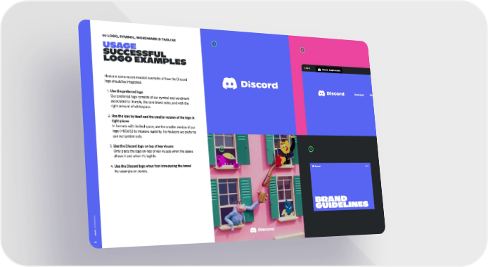 02 logo, symbol, wordmark & tagline 1 2 Usage successful Discord · Imagine a place logo examples Here are some recommended examples of how the Discord logo should be integratede Download Why Discord? Nitro 6e Use the preferred logo Our preferred logo consists of our symbol and wordmark associated to blurple, the core brand color, and with the right amount of whitespacee qe Use the icon by itself and the smaller version of the logo in tight places In formats with limited space, use the smaller version of our logo (<80x15) to improve legibility. For favicons we prefer to use our symbol onlye -e Use the Discord logo on top of key visuals 4 4 Only place the logo on-top of key visuals when the space allows it and when it’s legiblee *e Use the Discord logo when first introducing the brand Version 1.0 For example on covers. Brand guidelines d or Disc 24