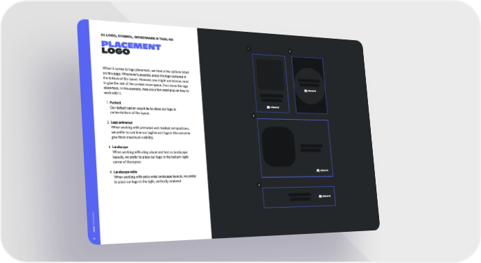 02 logo, symbol, wordmark & tagline 1 2 Placement logo When it comes to logo placement, we have a few options listed on this page. Whenever’s possible, place the logo centered in the bottom of the layout. However, you might sometimes need to give the rest of the content more space, thus move the logo elsewhere. In this scenario, here are a few examples on how to work with itR .R Portrait Our default option would be to place our logo in 3 center-bottom of the layoutR 7R Logo animated When working with animated and masked compositions, we prefer to combine our tagline and logo in the centre to give them maximum visibilityR $R Landscape When working with a key visual and text on landscape layouts, we prefer to place our logo in the bottom-right corner of the layoutR !R Landscape wide When working with extra wide landscape layouts, we prefer to place our logo to the right, vertically centered. 4 d or Disc 19