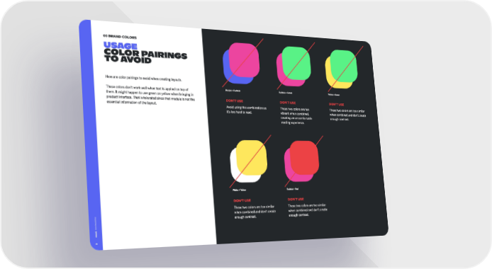 03 brand colors USAGE color pairings TO AVOID Here are color pairings to avoid when creating layouts. Blurple + Fuchsia Fuchsia + Green Yellow + Green These colors don’t work well when text is applied on top of them. It might happen to use green on yellow when bringing in DON’t USE DON’t USE DON’t USE product interface. That is tolerated since that module is not the essential information of the layout. Avoid using this combination as These two colors are too These two colors are too similar it’s too hard to read. vibrant when combined, when combined and don’t create creating an uncomfortable enough contrast. reading experience. White + Yellow Fuchsia + Red DON’t USE DON’t USE These two colors are too similar These two colors are too similar when combined and don’t create when combined and don’t create enough contrast. enough contrast. d or Disc 31