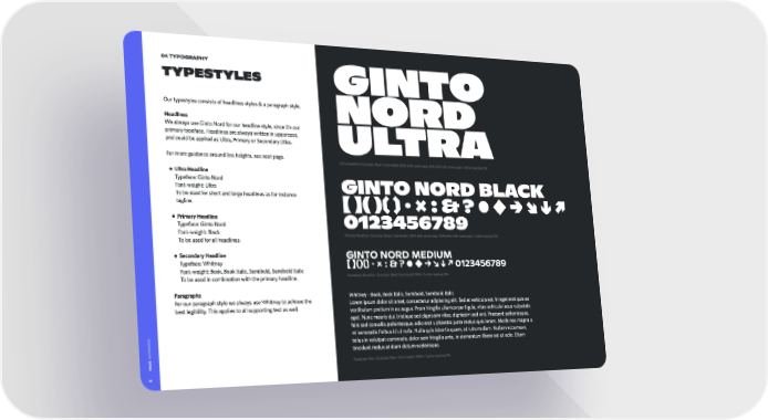 04 typography typestyles GINTO Our typestyles consists of headlines styles & a paragraph style. NORD Headlines We always use Ginto Nord for our headline style, since it’s our primary typeface. Headlines are always written in uppercase, and could be applied as Ultra, Primary or Secondary titles. ULTRA For more guidance around line heights, see next page+ Ultra Headline | Example: 90pt / Line-height 80% with some copy, 95% with a bit more copy / Letter-spacing 0% S Ultra Headline Typeface: Ginto Nord Font-weight: Ultra GINTO NORD BLACK To be used for short and large headlines as for instance tagline.H 【 】( )〔 〕 · × : & ? ● ◆ → ↘ ↓ ↗ S Primary Headline Typeface: Ginto Nord 0123456789 Font-weight: Black Primary Headline | Example: 50pt / Line-height: 90% with some copy, 110% with a bit more copy / Letter-spacing 0% To be used for all headlines+ S Secondary Headline GINTO NORD MEDIUM Typeface: Whitney 【 】()〔〕 · × : & ? ● ◆ → ↘ ↓ ↗ 0123456789 Font-weight: Book, Book Italic, Semibold, Semibold Italic Secondary Headline | Example: 24pt/ Line-height 90% / Letter-spacing 0% To be used in combination with the primary headline. Paragraphs Whitney - Book, Book Italic, Semibold, Semibold Italic For our paragraph style we always use Whitney to achieve the Lorem ipsum dolor sit amet, consectetur adipiscing elit. Sed et vehicula est. In eget erat quis ex best legibility. This applies to all supporting text as well. vestibulum pretium in eu augue. Proin fringilla ullamcorper ligula, vitae vehicula lacus vulputate eget. Nunc mauris dui, tristique sed dignissim vitae, dignissim sed orci. Praesent pellentesque, felis sed convallis pellentesque, odio erat v pharetra justo metus quis lorem. Morbi nec magna a mi venenatis finibus id ut nulla. Nulla quis lobortis quam, at rutrum diam. Nullam accumsan, tellus in volutpat commodo, dolor sem fringilla ante, in elementum libero est ut odio. Etiam tincidunt metus at diam dictum scelerisque. d or Paragraph Text | Example: 15pt / Line-height: 130% / Letter-spacing 0% Disc 42
