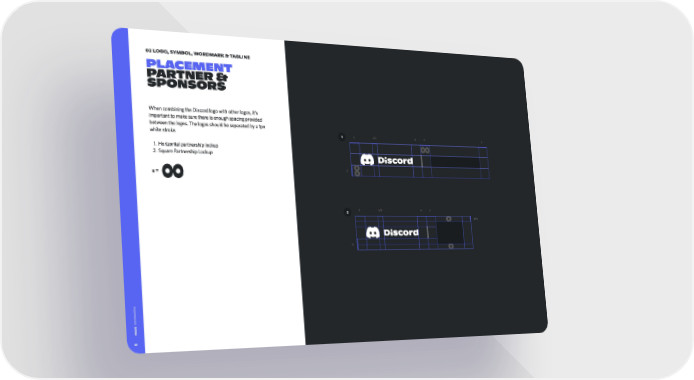 02 logo, symbol, wordmark & tagline placement partner & sponsors When combining the Discord logo with other logos, it’s important to make sure there is enough spacing provided between the logos. The logos should be separated by a 1px x x/2 x x x white stroke< 1 ,< Horizontal partnership locku7 )< Square Partnership Lockup x x = x x/2 x x 2 x/2 x d or Disc 22
