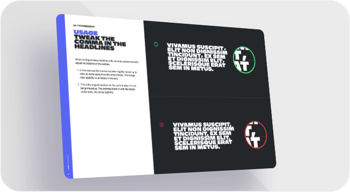 Vivamus suscipit 04 typography elit non dignissim Usage Tweak the tincidunt ex sem 1 , Vivamus suscipit comma in the elit non dignissim headlines , , tincidunt ex sem et dignissim elit , et dignissim elit When writing primary headlines with commas, please manually scelerisque erat adjust the baseline of the comma.' scelerisque erat sem in metus. %+ In this example the comma has been slightly moved up to clear up some space from the letters below. This brings sem in metus. clear legibility to all letters in the text+ + This is the original baseline for the comma when it’s not being moved up. The commas blend in with the letters underneath, disrupting legibility. Vivamus suscipit, elit non dignissim tincidunt, ex sem 2 Vivamus suscipit, elit non dignissim tincidunt, ex sem et dignissim elit, et dignissim elit, scelerisque erat sem in metus. scelerisque erat d or sem in metus. Disc 47