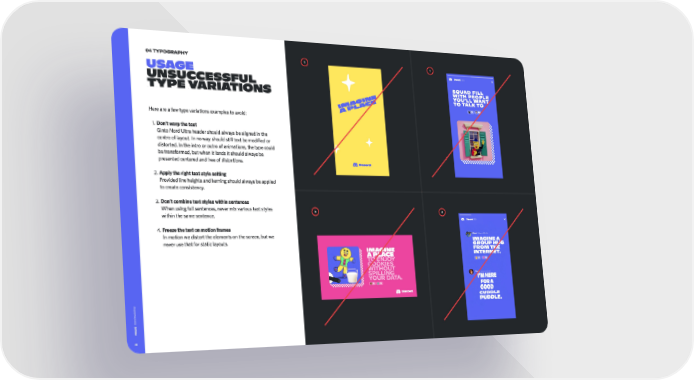 04 typography 1 1 Usage Squad fill unsucceSsful with people you’ll want type variations to talk to 23 48 Here are a few type variations examples to avoidH TP Don’t warp the text Ginto Nord Ultra header should always be aligned in the centre of layout. In no way should still text be modified or distorted. In the intro or outro of animations, the type could be transformed, but when it lands it should always be presented centered and free of distortionsP +P Apply the right text style setting Provided line heights and kerning should always be applied to create consistencyP &P Don’t combine text styles within sentences When using full sentences, never mix various text styles 3 4 within the same sentenceP #P Freeze the text on motion frames Today at 9:18 AM Shawn In motion we distort the elements on the screen, but we Imagine a never use that for static layouts. group hug from the imagine internet. a place 43 28 Imagine a to enjoy to talk place cookies fresh cuts, deep Today at 9:18 AM Gregz without cuts, or how spilling you like cold I’m here cuts your data. for a 72 72 16 25 good cuddle puddle. Today at 9:19 AM moongirl yassssss d or Disc 51