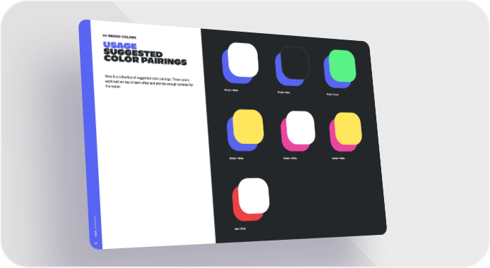 04 brand colors USAGE Suggested color pairings Here is a collection of suggested color pairings. These colors work well on-top of each other and provide enough contrast for Blurple + White Blurple + Black Blurple + Green the reader. Blurple + Yellow Fuchsia + White Fuchsia + Yellow d or Red + White Disc 30
