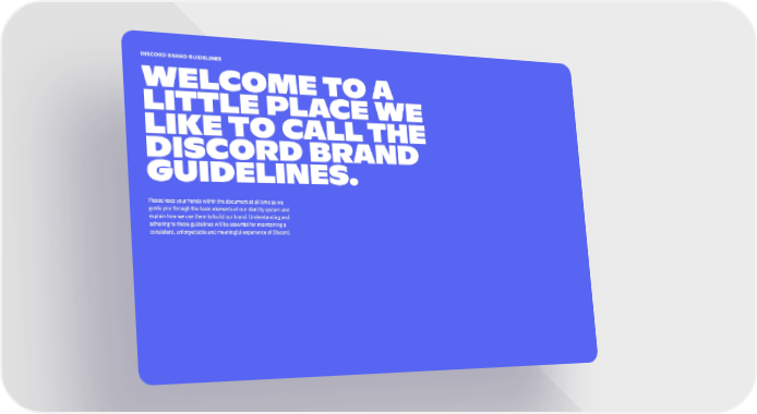 Discord brand guidelines Welcome to a little place we like to call The Discord Brand Guidelines. Please keep your hands within the document at all time as we guide you through the basic elements of our identity system and explain how we use them to build our brand. Understanding and adhering to these guidelines will be essential for maintaining a consistent, unforgettable and meaningful experience of Discord.