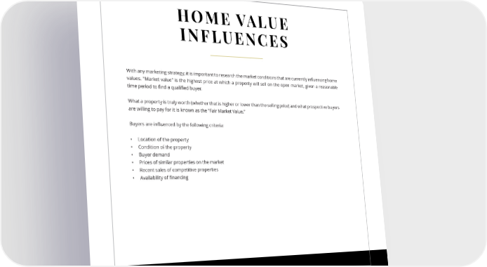 HOME VALUE INFLUENCES With any marketing strategy, it is important to research the market conditions that are currently in昀氀uencing home values. “Market value” is the highest price at which a property will sell on the open market, given a reasonable time period to 昀椀nd a quali昀椀ed buyer. What a property is truly worth (whether that is higher or lower than the selling price) and what prospective buyers are willing to pay for it is known as the “Fair Market Value.” Buyers are in昀氀uenced by the following criteria: • Location of the property • Condition of the property • Buyer demand • Prices of similar properties on the market • Recent sales of competitive properties • Availability of 昀椀nancing 16