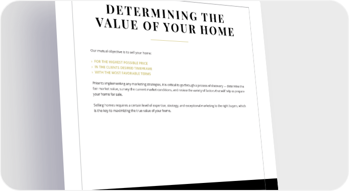 DETERMINING THE VALUE OF YOUR HOME Our mutual objective is to sell your home: › FOR THE HIGHEST POSSIBLE PRICE › IN THE CLIENTS DESIRED TIMEFRAME › WITH THE MOST FAVORABLE TERMS Prior to implementing any marketing strategies, it is critical to go through a process of discovery — determine the fair market value, survey the current market conditions, and review the variety of factors that will help us prepare your home for sale. Selling homes requires a certain level of expertise, strategy, and exceptional marketing to the right buyers, which is the key to maximizing the true value of your home. 14