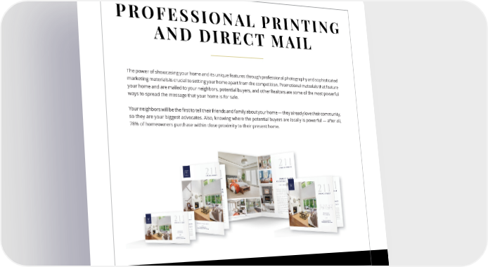 PROFESSIONAL PRINTING AND DIRECT MAIL The power of showcasing your home and its unique features through professional photography and sophisticated marketing materials is crucial to setting your home apart from the competition. Promotional materials that feature your home and are mailed to your neighbors, potential buyers, and other Realtors are some of the most powerful ways to spread the message that your home is for sale. Your neighbors will be the 昀椀rst to tell their friends and family about your home — they already love their community, so they are your biggest advocates. Also, knowing where the potential buyers are locally is powerful — after all, 78% of homeowners purchase within close proximity to their present home. 26