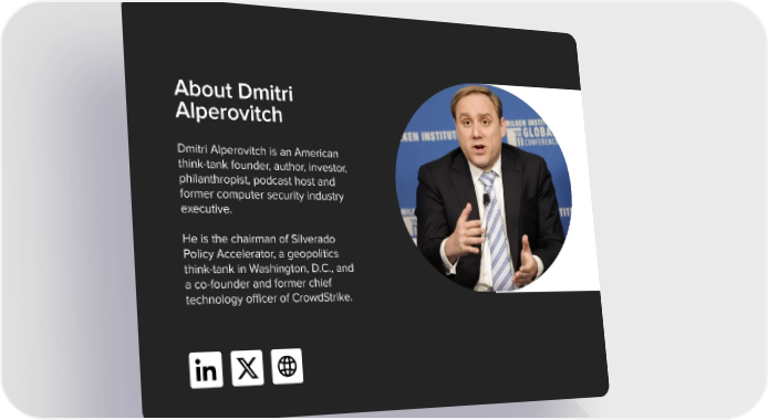 About Dmitri Alperovitch Dmitri Alperovitch is an American think-tank founder, author, investor, philanthropist, podcast host and former computer security industry executive. He is the chairman of Silverado Policy Accelerator, a geopolitics think-tank in Washington, D.C., and a co-founder and former chief technology officer of CrowdStrike.