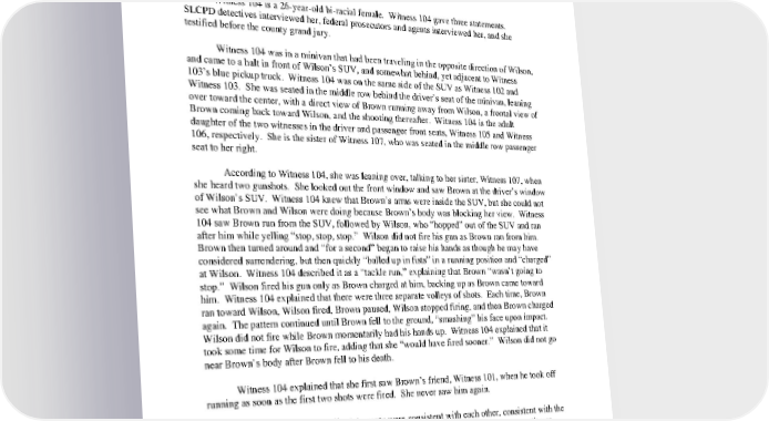Accordingly, after a thorough review of all the evidence, federal prosecutors determined his account to be credible, and likewise determined that a jury appropriately would credit his potential testimony. c. Witness 104 Witness 104 is a 26yearold biracial female. Witness 104 gave three statements. SLCPD detectives interviewed her, federal prosecutors and agents interviewed her, and she testified before the county grand jury. Witness 104 was in a minivan that had been traveling in the opposite direction of Wilson, and came to a halt in front of Wilson’s SUV, and somewhat behind, yet adjacent to Witness 103’s blue pickup truck. Witness 104 was on the same side of the SUV as Witness 102 and Witness 103. She was seated in the middle row behind the driver’s seat of the minivan, leaning over toward the center, with a direct view of Brown running away from Wilson, a frontal view of Brown coming back toward Wilson, and the shooting thereafter. Witness 104 is the adult daughter of the two witnesses in the driver and passenger front seats, Witness 105 and Witness 106, respectively. She is the sister of Witness 107, who was seated in the middle row passenger seat to her right. According to Witness 104, she was leaning over, talking to her sister, Witness 107, when she heard two gunshots. She looked out the front window and saw Brown at the driver’s window of Wilson’s SUV. Witness 104 knew that Brown’s arms were inside the SUV, but she could not see what Brown and Wilson were doing because Brown’s body was blocking her view. Witness 104 saw Brown run from the SUV, followed by Wilson, who “hopped” out of the SUV and ran after him while yelling “stop, stop, stop.” Wilson did not fire his gun as Brown ran from him. Brown then turned around and “for a second” began to raise his hands as though he may have considered surrendering, but then quickly “balled up in fists” in a running position and “charged” at Wilson. Witness 104 described it as a “tackle run,” explaining that Brown “wasn’t going to stop.” Wilson fired his gun only as Brown charged at him, backing up as Brown came toward him. Witness 104 explained that there were three separate volleys of shots. Each time, Brown ran toward Wilson, Wilson fired, Brown paused, Wilson stopped firing, and then Brown charged again. The pattern continued until Brown fell to the ground, “smashing” his face upon impact. Wilson did not fire while Brown momentarily had his hands up. Witness 104 explained that it took some time for Wilson to fire, adding that she “would have fired sooner.” Wilson did not go near Brown’s body after Brown fell to his death. Witness 104 explained that she first saw Brown’s friend, Witness 101, when he took off running as soon as the first two shots were fired. She never saw him again. All three of Witness 104’s statements were consistent with each other, consistent with the physical and forensic evidence, and consistent with other credible witness accounts. Witness 104 does not have a criminal history. Therefore, if called as a defense witness in a prosecution of Darren Wilson, this witness’s account would not be vulnerable to meaningful cross– examination and would not be subject to impeachment due to bias or inconsistencies in prior statements. Accordingly, after a thorough review of all the evidence, federal prosecutors 30