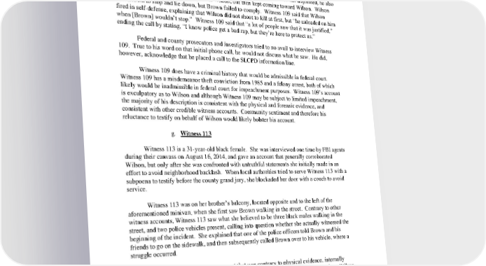 street when the officer asked them to get out of street. Brown responded something to the effect of, “Fuck the police.” According to Witness 109, Wilson got out of his vehicle and Brown, the “young guy that died,” hit him in the face. Witness 109 explained that Wilson reached for what appeared to be a taser but dropped it, and then grabbed a gun. Witness 109 explained that Brown reached for Wilson’s gun. Although Witness 109’s description was somewhat disjointed, he also stated that at first Brown ran away from Wilson, but then kept coming toward Wilson. Wilson told Brown to stop and lie down, but Brown failed to comply. Witness 109 said that Wilson fired in selfdefense, explaining that Wilson did not shoot to kill at first, but “he unloaded on him when [Brown] wouldn’t stop.” Witness 109 said that “a lot of people saw that it was justified,” ending the call by stating, “I know police get a bad rap, but they’re here to protect us.” Federal and county prosecutors and investigators tried to no avail to interview Witness 109. True to his word on that initial phone call, he would not discuss what he saw. He did, however, acknowledge that he placed a call to the SLCPD information line. Witness 109 does have a criminal history that would be admissible in federal court. Witness 109 has a misdemeanor theft conviction from 1985 and a felony arrest, both of which likely would be inadmissible in federal court for impeachment purposes. Witness 109’s account is exculpatory as to Wilson and although Witness 109 may be subject to limited impeachment, the majority of his description is consistent with the physical and forensic evidence, and consistent with other credible witness accounts. Community sentiment and therefore his reluctance to testify on behalf of Wilson would likely bolster his account. g. Witness 113 Witness 113 is a 31yearold black female. She was interviewed one time by FBI agents during their canvass on August 16, 2014, and gave an account that generally corroborated Wilson, but only after she was confronted with untruthful statements she initially made in an effort to avoid neighborhood backlash. When local authorities tried to serve Witness 113 with a subpoena to testify before the county grand jury, she blockaded her door with a couch to avoid service. Witness 113 was on her brother’s balcony, located opposite and to the left of the aforementioned minivan, when she first saw Brown walking in the street. Contrary to other witness accounts, Witness 113 saw what she believed to be three black males walking in the street, and two police vehicles present, calling into question whether she actually witnessed the beginning of the incident. She explained that one of the police officers told Brown and his friends to go on the sidewalk, and then subsequently called Brown over to his vehicle, where a struggle occurred. Witness 113 then gave an account that was contrary to physical evidence, internally inconsistent, and admittedly untrue. She first explained that Brown ran east, away from Wilson, as Wilson shot at him. However, she then explained that she watched as Brown ran west past Wilson, who shot Brown right next to the SUV. Witness 113 stated that Wilson fired shots into Brown’s back as he lay flat on his stomach on the ground. When the FBI told Witness 113 that the autopsy results and other evidence were inconsistent with her account, she admitted that she 33