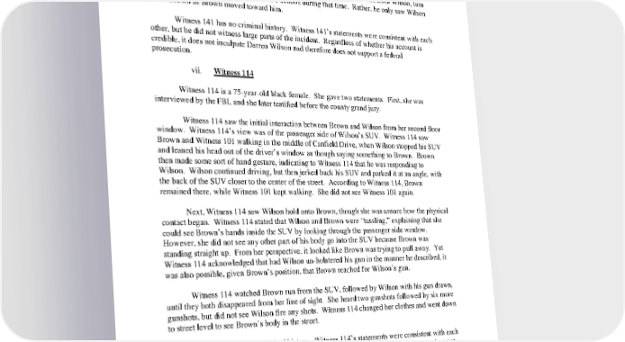Witness 141 testified before the county grand jury that he thought that after Wilson fired the first shot, the additional shots were “excessive,” an opinion that would be inadmissible in federal court, and a misstatement of the applicable federal law. Witness 141 based that opinion on the fact that he did not perceive Brown to be a physical threat. However, he acknowledged that he did not see what led up to the initial shots, and did not see Brown run from Wilson, turn around to face Wilson, or any of Brown’s actions during that time. Rather, he only saw Wilson shoot Brown as Brown moved toward him. Witness 141 has no criminal history. Witness 141’s statements were consistent with each other, but he did not witness large parts of the incident. Regardless of whether his account is credible, it does not inculpate Darren Wilson and therefore does not support a federal prosecution. vii. Witness 114 Witness 114 is a 75yearold black female. She gave two statements. First, she was interviewed by the FBI, and she later testified before the county grand jury. Witness 114 saw the initial interaction between Brown and Wilson from her second floor window. Witness 114’s view was of the passenger side of Wilson’s SUV. Witness 114 saw Brown and Witness 101 walking in the middle of Canfield Drive, when Wilson stopped his SUV and leaned his head out of the driver’s window as though saying something to Brown. Brown then made some sort of hand gesture, indicating to Witness 114 that he was responding to Wilson. Wilson continued driving, but then jerked back his SUV and parked it at an angle, with the back of the SUV closer to the center of the street. According to Witness 114, Brown remained there, while Witness 101 kept walking. She did not see Witness 101 again. Next, Witness 114 saw Wilson hold onto Brown, though she was unsure how the physical contact began. Witness 114 stated that Wilson and Brown were “tussling,” explaining that she could see Brown’s hands inside the SUV by looking through the passenger side window. However, she did not see any other part of his body go into the SUV because Brown was standing straight up. From her perspective, it looked like Brown was trying to pull away. Yet Witness 114 acknowledged that had Wilson unholstered his gun in the manner he described, it was also possible, given Brown’s position, that Brown reached for Wilson’s gun. Witness 114 watched Brown run from the SUV, followed by Wilson with his gun drawn, until they both disappeared from her line of sight. She heard two gunshots followed by six more gunshots, but did not see Wilson fire any shots. Witness 114 changed her clothes and went down to street level to see Brown’s body in the street. Witness 114 has no criminal history. Witness 114’s statements were consistent with each other, however, she did not see the majority of the shooting. Accordingly, her account does not inculpate Wilson and therefore does not support a federal prosecution. viii. Witness 129 42