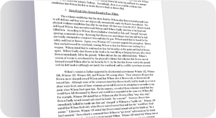 account lack credibility for the reasons set forth above, i.e. he did not witness significant parts of the shooting and based parts of his account on assumption. Witnesses 128 and 137 initially claimed that Wilson fired at Brown while he was running away, but then acknowledged that they did not see what Wilson and Brown were doing at this point and thus do not know whether Wilson fired at Brown as he was running away. Witnesses 105 and 106 thought they saw Wilson fire at Brown as he was running, but describe seeing Brown hit in the leg and back in a manner that does not match the autopsy findings. Accordingly, there is no credible evidence that establishes that Wilson fired at or struck Brown’s back as Brown fled. 3. Shots Fired After Brown Turned to Face Wilson ywvutsrponmlihgfedcbaYWVUTSRPONMLJIHGFEDCBA The evidence establishes that the shots fired by Wilson after Brown turned around were in selfdefense and thus were not objectively unreasonable under the Fourth Amendment. The physical evidence establishes that after he ran about 180 feet away from the SUV, Brown turned and faced Wilson, then moved toward Wilson until Wilson finally shot him in the head and killed him. According to Wilson, Brown balled or clenched his fists and “charged” forward, ignoring commands to stop. Knowing that Brown was much larger than him and that he had previously attempted to overpower him and take his gun, Wilson stated that he feared for his safety and fired at Brown. Again, even Witness 101’s account supports this perception. Brown then reached toward his waistband, causing Wilson to fear that Brown was reaching for a weapon. Wilson stated that he continued to fear for his safety at this point and fired at Brown again. Wilson finally shot Brown in the head as he was falling or lunging forward, after which Brown immediately fell to the ground. Wilson did not fire any additional shots. Wilson’s version of events is corroborated by the physical evidence that indicates that Brown moved forward toward Wilson after he ran from the SUV, by the fact that Brown went to the ground with his left hand at (although not inside) his waistband, and by credible eyewitness accounts. Wilson’s version is further supported by disinterested eyewitnesses Witness 102, Witness 104, Witness 105, Witness 108, and Witness 109, among others. These witnesses all agree that Brown ran or charged toward Wilson and that Wilson shot at Brown only as Brown moved toward him. Although some of the witnesses stated that Brown briefly had his hands up or out at about waistlevel, none of these witnesses perceived Brown to be attempting to surrender at any point when Wilson fired upon him. To the contrary, several of these witnesses stated that they would have felt threatened by Brown and would have responded in the same way Wilson did. For example, Witness 104 stated that as Wilson ran after Brown yelling “stop, stop, stop,” Brown finally turned around and raised his hands “for a second.” However, Brown then immediately balled his hands into fists and “charged” at Wilson in a “tackle run.” Witness 104 stated that Wilson fired only when Brown moved toward him and that she “would have fired sooner.” Likewise, Witness 105 stated that Brown turned around and put his hands up “for a brief moment,” then refused a command from Wilson to “get down” and instead put his hands “in running position” and started running toward Wilson. Witness 105 stated that Wilson shot at Brown only when Brown was moving toward him. These witnesses’ accounts are consistent with prior statements they have given, consistent with the forensic and physical evidence, and consistent with each other’s accounts. Accordingly, we conclude that these accounts are credible. 82