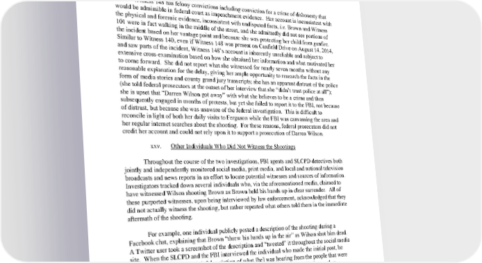 Federal prosecutors asked Witness 148 why she chose not report to the FBI or the SLCPD, since her distrust was specific to the FPD. Witness 148 explained that she did not know that either of those agencies was investigating, despite the fact that she went to Ferguson everyday for three months and admittedly, read media reports about the shooting in the hours, days, and weeks after it occurred. Witness 148 has felony convictions including conviction for a crime of dishonesty that would be admissible in federal court as impeachment evidence. Her account is inconsistent with the physical and forensic evidence, inconsistent with undisputed facts, i.e. Brown and Witness 101 were in fact walking in the middle of the street, and she admittedly did not see portions of the incident based on her vantage point and because she was protecting her child from gunfire. Similar to Witness 140, even if Witness 148 was present on Canfield Drive on August 14, 2014, and saw parts of the incident, Witness 148’s account is inherently unreliable and subject to extensive crossexamination based on how she obtained her information and what motivated her to come forward. She did not report what she witnessed for nearly seven months without any reasonable explanation for the delay, giving her ample opportunity to research the facts in the form of media stories and county grand jury transcripts; she has an apparent distrust of the police (she told federal prosecutors at the outset of her interview that she “didn’t trust police at all”); she is upset that “Darren Wilson got away” with what she believes to be a crime and then subsequently engaged in months of protests, but yet she failed to report it to the FBI, not because of distrust, but because she was unaware of the federal investigation. This is difficult to reconcile in light of both her daily visits to Ferguson while the FBI was canvassing the area and her regular internet searches about the shooting. For these reasons, federal prosecutors did not credit her account and could not rely upon it to support a prosecution of Darren Wilson. xxv. Other Individuals Who Did Not Witness the Shootings Throughout the course of the two investigations, FBI agents and SLCPD detectives both jointly and independently monitored social media, print media, and local and national television broadcasts and news reports in an effort to locate potential witnesses and sources of information. Investigators tracked down several individuals who, via the aforementioned media, claimed to have witnessed Wilson shooting Brown as Brown held his hands up in clear surrender. All of these purported witnesses, upon being interviewed by law enforcement, acknowledged that they did not actually witness the shooting, but rather repeated what others told them in the immediate aftermath of the shooting. For example, one individual publicly posted a description of the shooting during a Facebook chat, explaining that Brown “threw his hands up in the air” as Wilson shot him dead. A Twitter user took a screenshot of the description and “tweeted” it throughout the social media site. When the SLCPD and the FBI interviewed the individual who made the initial post, he explained that he “gave a brief description of what [he] was hearing from the people that were outside” on Canfield Drive, but he did not witness the incident itself. Similarly, another individual publicly “tweeted” about the shooting as though he had just witnessed it, even though he had not. Likewise, another individual appeared on a television program and discussed the shooting as if he had seen it firsthand. When law enforcement interviewed him, he explained that it was a 77