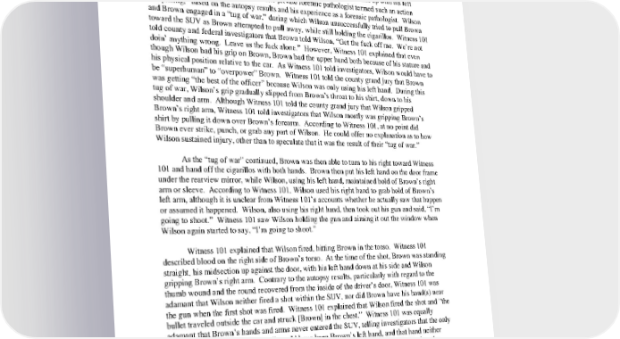 Witness 101’s proximity to the door. The door quickly bounced off of Brown and Witness 101 and shut on Wilson. According to Witness 101, this angered Brown. Witness 101 also stated that he understood how Wilson could have perceived that Brown shut the door on him. According to Witness 101, Wilson then reached out the window and up with his left hand, grabbing Brown by the throat. The private forensic pathologist termed such an action “surprising,” based on the autopsy results and his experience as a forensic pathologist. Wilson and Brown engaged in a “tug of war,” during which Wilson unsuccessfully tried to pull Brown toward the SUV as Brown attempted to pull away, while still holding the cigarillos. Witness 101 told county and federal investigators that Brown told Wilson, “Get the fuck off me. We’re not doin’ anything wrong. Leave us the fuck alone.” However, Witness 101 explained that even though Wilson had his grip on Brown, Brown had the upper hand both because of his stature and his physical position relative to the car. As Witness 101 told investigators, Wilson would have to be “superhuman” to “overpower” Brown. Witness 101 told the county grand jury that Brown was getting “the best of the officer” because Wilson was only using his left hand. During this tug of war, Wilson’s grip gradually slipped from Brown’s throat to his shirt, down to his shoulder and arm. Although Witness 101 told the county grand jury that Wilson gripped Brown’s right arm, Witness 101 told investigators that Wilson mostly was gripping Brown’s shirt by pulling it down over Brown’s forearm. According to Witness 101, at no point did Brown ever strike, punch, or grab any part of Wilson. He could offer no explanation as to how Wilson sustained injury, other than to speculate that it was the result of their “tug of war.” As the “tug of war” continued, Brown was then able to turn to his right toward Witness 101 and hand off the cigarillos with both hands. Brown then put his left hand on the door frame under the rearview mirror, while Wilson, using his left hand, maintained hold of Brown’s right arm or sleeve. According to Witness 101, Wilson used his right hand to grab hold of Brown’s left arm, although it is unclear from Witness 101’s accounts whether he actually saw that happen or assumed it happened. Wilson, also using his right hand, then took out his gun and said, “I’m going to shoot.” Witness 101 saw Wilson holding the gun and aiming it out the window when Wilson again started to say, “I’m going to shoot.” Witness 101 explained that Wilson fired, hitting Brown in the torso. Witness 101 described blood on the right side of Brown’s torso. At the time of the shot, Brown was standing straight, his midsection up against the door, with his left hand down at his side and Wilson gripping Brown’s right arm. Contrary to the autopsy results, particularly with regard to the thumb wound and the round recovered from the inside of the driver’s door, Witness 101 was adamant that Wilson neither fired a shot within the SUV, nor did Brown have his hand(s) near the gun when the first shot was fired. Witness 101 explained that Wilson fired the shot and “the bullet traveled outside the car and struck [Brown] in the chest.” Witness 101 was equally adamant that Brown’s hands and arms never entered the SUV, telling investigators that the only hand that would have been “free” would have been Brown’s left hand, and that hand neither entered the vehicle nor “reached for” Wilson’s gun. However, when he testified before the county grand jury, Witness 101 made room for the possibility that Brown’s arm entered the SUV when he was not looking. According to Witness 101, after the first shot, Brown and Witness 101 simultaneously ran eastbound, away from the SUV. Witness 101 explained that he got ahead of Brown, such 45
