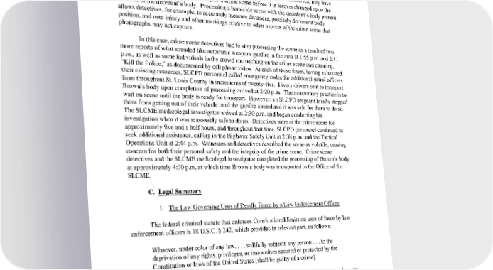St. Louis County Medical Examiner (“SCLME”) to respond to the scene. To further protect the integrity of the crime scene, and in accordance with common police practice, SLCPD personnel did not permit family members and concerned neighbors into the crime scene (with one brief exception). Also in accordance with common police practice, crime scene detectives processed the crime scene with Brown’s body present. According to SLCPD CAP detectives, they have one opportunity to thoroughly investigate a crime scene before it is forever changed upon the removal of the decedent’s body. Processing a homicide scene with the decedent’s body present allows detectives, for example, to accurately measure distances, precisely document body position, and note injury and other markings relative to other aspects of the crime scene that photographs may not capture. In this case, crime scene detectives had to stop processing the scene as a result of two more reports of what sounded like automatic weapons gunfire in the area at 1:55 p.m. and 2:11 p.m., as well as some individuals in the crowd encroaching on the crime scene and chanting, “Kill the Police,” as documented by cell phone video. At each of those times, having exhausted their existing resources, SLCPD personnel called emergency codes for additional patrol officers from throughout St. Louis County in increments of twentyfive. Livery drivers sent to transport Brown’s body upon completion of processing arrived at 2:20 p.m. Their customary practice is to wait on scene until the body is ready for transport. However, an SLCPD sergeant briefly stopped them from getting out of their vehicle until the gunfire abated and it was safe for them to do so. The SLCME medicolegal investigator arrived at 2:30 p.m. and began conducting his investigation when it was reasonably safe to do so. Detectives were at the crime scene for approximately five and a half hours, and throughout that time, SLCPD personnel continued to seek additional assistance, calling in the Highway Safety Unit at 2:38 p.m. and the Tactical Operations Unit at 2:44 p.m. Witnesses and detectives described the scene as volatile, causing concern for both their personal safety and the integrity of the crime scene. Crime scene detectives and the SLCME medicolegal investigator completed the processing of Brown’s body at approximately 4:00 p.m, at which time Brown’s body was transported to the Office of the SLCME. C. Legal Summary 1. The Law Governing Uses of Deadly Force by a Law Enforcement Officer The federal criminal statute that enforces Constitutional limits on uses of force by law enforcement officers is 18 U.S.C. § 242, which provides in relevant part, as follows: Whoever, under color of any law, . . . willfully subjects any person . . . to the deprivation of any rights, privileges, or immunities secured or protected by the Constitution or laws of the United States [shall be guilty of a crime]. To prove a violation of Section 242, the government must prove the following elements beyond a reasonable doubt: (1) that the defendant was acting under color of law, (2) that he deprived a victim of a right protected by the Constitution or laws of the United States, (3) that he acted willfully, and (4) that the deprivation resulted in bodily injury and/or death. There is no dispute that Wilson, who was on duty and working as a patrol officer for the FPD, acted under 9