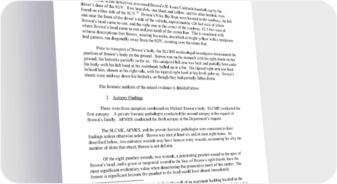 10 toward which Wilson had been shooting. As described below, crime scene detectives noted 11 apparent blood in the roadway approximately 17 feet and 22 feet east of where Brown’s body was found and east of the casings that were recovered, consistent with Brown moving toward Wilson before his death. There was no other blood found in the roadway, other than the pool of blood surrounding Brown’s body. Crime scene detectives recovered Brown’s St. Louis Cardinals baseball cap by the driver’s door of the SUV. Two bracelets, one black and yellow, and the other beaded, were 12 found on either side of the SUV. Brown’s Nike flip flops were located in the roadway, the left one near the front of the driver’s side of the vehicle, approximately 126 feet west of where Brown’s head came to rest, and the right one in the center of the roadway, 82.5 feet west of where Brown’s head came to rest and just south of the center line. This is consistent with witness descriptions that Brown, wearing his socks, described as bright yellow with a marijuana leaf pattern, ran diagonally away from the SUV, crossing over the center line. Prior to transport of Brown’s body, the SLCME medicolegal investigator documented the position of Brown’s body on the ground. Brown was on his stomach with his right cheek on the ground, his buttocks partially in the air. His uninjured left arm was back and partially bent under his body with his left hand at his waistband, balled up in a fist. His injured right arm was back behind him, almost at his right side, with his injured right hand at hip level, palm up. Brown’s shorts were midway down his buttocks, as though they had partially fallen down. The forensic analysis of the seized evidence is detailed below: 2. Autopsy Findings There were three autopsies conducted on Michael Brown’s body. SLCME conducted the first autopsy. A private forensic pathologist conducted the second autopsy at the request of Brown’s family. AFMES conducted the third autopsy at the Department’s request. The SLCME, AFMES, and the private forensic pathologist were consistent in their findings unless otherwise noted. Brown was shot at least six and at most eight times. As described below, two entrance wounds may have been reentry wounds, accounting for why the number of shots that struck Brown is not definite. Of the eight gunshot wounds, two wounds, a penetrating gunshot wound to the apex of Brown’s head, and a graze or tangential wound to the base of Brown’s right thumb, have the most significant evidentiary value when determining the prosecutive merit of this matter. The former is significant because the gunshot to the head would have almost immediately 10 Crime scene detectives also noted a hole in the wall of an apartment building located on the south side of Canfield Drive, east of Wilson’s SUV. They removed a small section of siding, but were unable to determine whether there was a projectile within the wall without causing significant structural damage to the building. There is no evidence to indicate what caused the hole or when it was made. 11 As noted below, the blood in the roadway was determined to be Brown’s blood. 12 It was never determined to whom these bracelets belong or when they were left in the street. 17