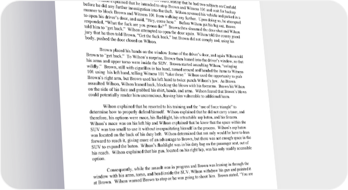 responded, “Fuck what you have to say.” As Wilson drove past Brown, he saw cigarillos in Brown’s hand, which alerted him to a radio dispatch of a “stealing in progress” that he heard a few minutes prior while finishing his last call. Wilson then checked his rearview mirror, and realized that Witness 101 matched the description of the other subject on the radio dispatch. Wilson requested assistance over the radio, stating that he had two subjects on Canfield Drive. Wilson explained that he intended to stop Brown and Witness 101 and wait for backup before he did any further investigation into the theft. Wilson reversed his vehicle and parked in a manner to block Brown and Witness 101 from walking any further. Upon doing so, he attempted to open his driver’s door, and said, “Hey, come here.” Before Wilson got his leg out, Brown 4 responded, “What the fuck are you gonna do?” Brown then slammed the door shut and Wilson told him to “get back.” Wilson attempted to open the door again. Wilson told the county grand jury that he then told Brown, “Get the fuck back,” but Brown did not comply and, using his body, pushed the door closed on Wilson. Brown placed his hands on the window frame of the driver’s door, and again Wilson told Brown to “get back.” To Wilson’s surprise, Brown then leaned into the driver’s window, so that his arms and upper torso were inside the SUV. Brown started assaulting Wilson, “swinging wildly.” Brown, still with cigarillos in his hand, turned around and handed the items to Witness 101 using his left hand, telling Witness 101 “take these.” Wilson used the opportunity to grab Brown’s right arm, but Brown used his left hand to twice punch Wilson’s jaw. As Brown assaulted Wilson, Wilson leaned back, blocking the blows with his forearms. Brown hit Wilson on the side of his face and grabbed his shirt, hands, and arms. Wilson feared that Brown’s blows could potentially render him unconscious, leaving him vulnerable to additional harm. Wilson explained that he resorted to his training and the “use of force triangle” to determine how to properly defend himself. Wilson explained that he did not carry a taser, and therefore, his options were mace, his flashlight, his retractable asp baton, and his firearm. Wilson’s mace was on his left hip and Wilson explained that he knew that the space within the SUV was too small to use it without incapacitating himself in the process. Wilson’s asp baton was located on the back of his duty belt. Wilson determined that not only would he have to lean forward to reach it, giving more of an advantage to Brown, but there was not enough space in the SUV to expand the baton. Wilson’s flashlight was in his duty bag on the passenger seat, out of his reach. Wilson explained that his gun, located on his right hip, was his only readily accessible option. Consequently, while the assault was in progress and Brown was leaning in through the window with his arms, torso, and head inside the SUV, Wilson withdrew his gun and pointed it at Brown. Wilson warned Brown to stop or he was going to shoot him. Brown stated, “You are 4 The Ferguson Market store clerk’s daughter stated that Brown used a similar statement when her father tried to stop Brown from stealing cigarillos, i.e., “What you gonna do?” While it might seem odd that a person in Brown’s position would verbally confront a police officer, the fact that another witness at a separate location described Brown as speaking similarly a few minutes earlier tends to corroborate Wilson. 13