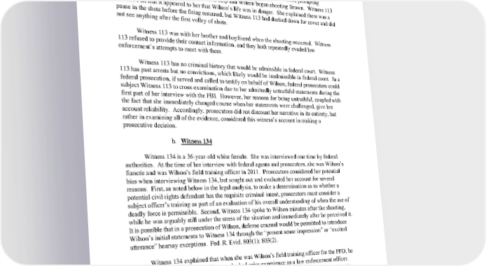 lied. She explained to the FBI that, “You’ve gotta live the life to know it,” and stated that she feared offering an account contrary to the narrative reported by the media that Brown held his hands up in surrender. Witness 113 then admitted that she saw Brown running toward Wilson, prompting Wilson to yell, “Freeze.” Brown failed to stop and Wilson began shooting Brown. Witness 113 told the FBI that it appeared to her that Wilson’s life was in danger. She explained there was a pause in the shots before the firing resumed, but Witness 113 had ducked down for cover and did not see anything after the first volley of shots. Witness 113 was with her brother and boyfriend when the shooting occurred. Witness 113 refused to provide their contact information, and they both repeatedly evaded law enforcement’s attempts to meet with them. Witness 113 has no criminal history that would be admissible in federal court. Witness 113 has past arrests but no convictions, which likely would be inadmissible in federal court. In a federal prosecution, if served and called to testify on behalf of Wilson, federal prosecutors could subject Witness 113 to crossexamination due to her admittedly untruthful statements during the first part of her interview with the FBI. However, her reasons for being untruthful, coupled with the fact that she immediately changed course when her statements were challenged, give her account reliability. Accordingly, prosecutors did not discount her narrative in its entirety, but rather in examining all of the evidence, considered this witness’s account in making a prosecutive decision. h. Witness 134 Witness 134 is a 36yearold white female. She was interviewed one time by federal authorities. At the time of her interview with federal agents and prosecutors, she was Wilson’s fiancée and was Wilson’s field training officer in 2011. Prosecutors considered her potential bias when interviewing Witness 134, but sought out and evaluated her account for several reasons. First, as noted below in the legal analysis, to make a determination as to whether a potential civil rights defendant has the requisite criminal intent, prosecutors must consider a subject officer’s training as part of an evaluation of his overall understanding of when the use of deadly force is permissible. Second, Witness 134 spoke to Wilson minutes after the shooting, while he was arguably still under the stress of the situation and immediately after he perceived it. It is possible that in a prosecution of Wilson, defense counsel would be permitted to introduce Wilson’s initial statements to Witness 134 through the “present sense impression” or “excited utterance” hearsay exceptions. Fed. R. Evid. 803(1); 803(2). Witness 134 explained that when she was Wilson’s field training officer for the FPD, he did not require a lot of training because he had prior experience as a law enforcement officer. Wilson knew and understood that he was permitted to use physical force when he or someone else was met with a physical threat. As Wilson’s training officer, she never had concerns as to whether he understood when he was permitted to use force. 34