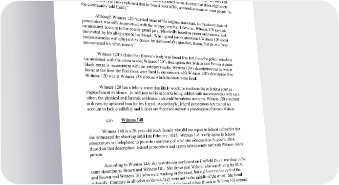 vehicle. Brown said, “Please don’t shoot me,” and Wilson fired a shot into Brown’s head at “point blank” range. However, during the second interview, Witness 120 acknowledged that he never saw Wilson emerge from his vehicle and never saw any injury on Brown. Instead, he claimed that after that second shot, he ran downstairs and heard two volleys of four shots each with a pause in between. By the time he got downstairs, the gunfire had ended. Witness 120 explained that although he did not see the shots, common sense dictates that those eight shots struck Brown. He also explained that he based most of his recanted account on what people “in the community told [him].” Although Witness 120 recanted most of his original statement, his version to federal prosecutors was still inconsistent with the autopsy results. Likewise, Witness 120 gave an inconsistent account to the county grand jury, admittedly based on rumor and hearsay, and motivated by his allegiance to his friend. When grand jurors questioned Witness 120 about inconsistencies with physical evidence, he dismissed the question, stating that Brown “was assassinated for what reason.” Witness 120’s claim that Brown’s body was found five feet from the police vehicle is inconsistent with the crime scene; Witness 120’s description that Wilson shot Brown at point blank range is inconsistent with the autopsy results; Witness 120’s description that he was at home at the time the first shots were fired is inconsistent with Witness 138’s description that Witness 120 was at Witness 138’s house when the shots were fired. Witness 120 has a felony arrest that likely would be inadmissible in federal court as impeachment evidence. In addition to his accounts being riddled with inconsistencies with each other, the physical and forensic evidence, and credible witness accounts, Witness 120’s account is driven by apparent bias for his friend. Accordingly, federal prosecutors determined his account to lack credibility and it does not therefore support a prosecution of Darren Wilson. xxiv. Witness 148 Witness 148 is a 26yearold black female who did not report to federal authorities that she witnessed the shooting until late February, 2015. Witness 148 briefly spoke to federal prosecutors via telephone to provide a summary of what she witnessed on August 9, 2014. Based on that description, federal prosecutors and agents subsequently met with Witness 148 in person. According to Witness 148, she was driving eastbound on Canfield Drive, traveling in the same direction as Brown and Witness 101. She drove past Wilson, who was driving his SUV, and Brown and Witness 101 who were walking in the street, but right next to the curb of the sidewalk. Contrary to all other evidence, they were not in the middle of the street. She heard Wilson say, “Get the fuck on the sidewalk,” and she heard either Brown or Witness 101 respond that they were near their “destination.” Suspecting something was going to happen between Wilson and Brown and Witness 101 because she is from Chicago and is used to bad interactions with police, she slowed down and watched over her right shoulder, out her back window. She heard tires “screech” and saw the SUV reverse back. 75