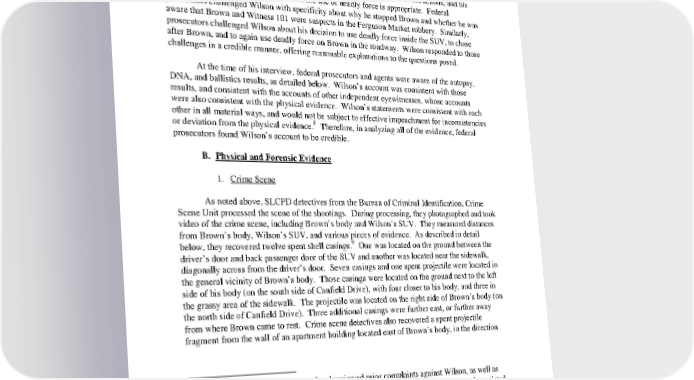 assumed that since he was not bleeding, the blood likely belonged to Brown, and therefore, Brown’s DNA would be present. During Wilson’s interview with federal authorities, prosecutors and agents focused on whether he was consistent with his previous statements, the motivation for his actions, and his training and experience relative to when the use of deadly force is appropriate. Federal prosecutors challenged Wilson with specificity about why he stopped Brown and whether he was aware that Brown and Witness 101 were suspects in the Ferguson Market robbery. Similarly, prosecutors challenged Wilson about his decision to use deadly force inside the SUV, to chase after Brown, and to again use deadly force on Brown in the roadway. Wilson responded to those challenges in a credible manner, offering reasonable explanations to the questions posed. ywvutsrponmlihgfedcbaYWVUTSRPONMLJIHGFEDCBA At the time of his interview, federal prosecutors and agents were aware of the autopsy, DNA, and ballistics results, as detailed below. Wilson’s account was consistent with those results, and consistent with the accounts of other independent eyewitnesses, whose accounts were also consistent with the physical evidence. Wilson’s statements were consistent with each other in all material ways, and would not be subject to effective impeachment for inconsistencies 8 or deviation from the physical evidence. Therefore, in analyzing all of the evidence, federal prosecutors found Wilson’s account to be credible. B. Physical and Forensic Evidence 1. Crime Scene As noted above, SLCPD detectives from the Bureau of Criminal Identification, Crime Scene Unit processed the scene of the shootings. During processing, they photographed and took video of the crime scene, including Brown’s body and Wilson’s SUV. They measured distances from Brown’s body, Wilson’s SUV, and various pieces of evidence. As described in detail 9 below, they recovered twelve spent shell casings. One was located on the ground between the driver’s door and back passenger door of the SUV and another was located near the sidewalk, diagonally across from the driver’s door. Seven casings and one spent projectile were located in the general vicinity of Brown’s body. Those casings were located on the ground next to the left side of his body (on the south side of Canfield Drive), with four closer to his body, and three in the grassy area of the sidewalk. The projectile was located on the right side of Brown’s body (on the north side of Canfield Drive). Three additional casings were further east, or further away from where Brown came to rest. Crime scene detectives also recovered a spent projectile fragment from the wall of an apartment building located east of Brown’s body, in the direction 8 Federal prosecutors were aware of and reviewed prior complaints against Wilson, as well as media reports, alleging Wilson engaged in misconduct. Such allegations were not substantiated, and do not contain information admissible in federal court in support of a prosecution. 9 The locations of the shell casings are consistent with Wilson’s account and the credible witness accounts. However, shell casings provide limited evidentiary value relative to the precise location of the shooter and bullet trajectory because they tend to bounce and roll unpredictably after being ejected from the firearm and before coming to rest. 16