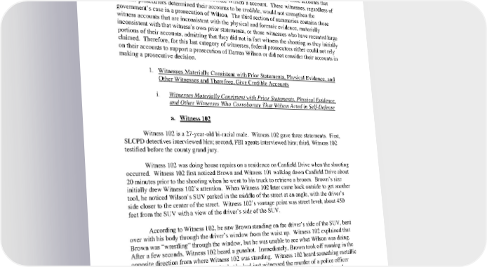 course, to support a prosecution of Wilson under 18 U.S.C. § 242, the weight of the evidence from those witness accounts that support a prosecution must be prove the violation beyond a reasonable doubt to twelve reasonable jurors. A prosecution will fail if the credible evidence creates “reasonable doubt” of Wilson’s guilt by supporting Wilson’s statements that he acted reasonably and in selfdefense. The second section of summaries contains those accounts that neither inculpate Wilson nor fully corroborate Wilson’s account. These witnesses, regardless of whether prosecutors determined their accounts to be credible, would not strengthen the government’s case in a prosecution of Wilson. The third section of summaries contains those witness accounts that are inconsistent with the physical and forensic evidence, materially inconsistent with that witness’s own prior statements, or those witnesses who have recanted large portions of their accounts, admitting that they did not in fact witness the shooting as they initially claimed. Therefore, for this last category of witnesses, federal prosecutors either could not rely on their accounts to support a prosecution of Darren Wilson or did not consider their accounts in making a prosecutive decision. 1. Witnesses Materially Consistent with Prior Statements, Physical Evidence, and Other Witnesses and Therefore, Give Credible Accounts i. Witnesses Materially Consistent with Prior Statements, Physical Evidence, and Other Witnesses Who Corroborate That Wilson Acted in Self-Defense a. Witness 102 Witness 102 is a 27yearold biracial male. Witness 102 gave three statements. First, SLCPD detectives interviewed him; second, FBI agents interviewed him; third, Witness 102 testified before the county grand jury. Witness 102 was doing house repairs on a residence on Canfield Drive when the shooting occurred. Witness 102 first noticed Brown and Witness 101 walking down Canfield Drive about 20 minutes prior to the shooting when he went to his truck to retrieve a broom. Brown’s size initially drew Witness 102’s attention. When Witness 102 later came back outside to get another tool, he noticed Wilson’s SUV parked in the middle of the street at an angle, with the driver’s side closer to the center of the street. Witness 102’s vantage point was street level, about 450 feet from the SUV with a view of the driver’s side of the SUV. According to Witness 102, he saw Brown standing on the driver’s side of the SUV, bent over with his body through the driver’s window from the waist up. Witness 102 explained that Brown was “wrestling” through the window, but he was unable to see what Wilson was doing. After a few seconds, Witness 102 heard a gunshot. Immediately, Brown took off running in the opposite direction from where Witness 102 was standing. Witness 102 heard something metallic hit the ground. Witness 102 thought that he had just witnessed the murder of a police officer because a few seconds passed before Wilson emerged from the SUV. Wilson then chased Brown with his gun drawn, but not pointed at Brown, until Brown abruptly turned around at a nearby driveway. Witness 102 explained that it made no sense to him why Brown turned around. Brown did not get on the ground or put his hands up in surrender. In fact, Witness 102 told investigators that he knew “for sure that [Brown’s] hands were not above his head.” Rather, 27