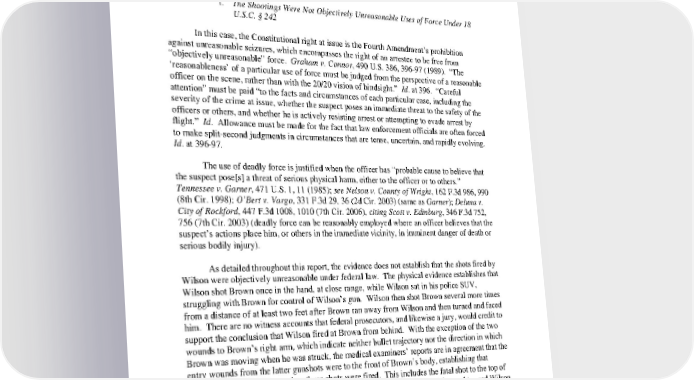 yxwvutsrponmlkjihgfedcbaWVUTSRPONMLIHGFEDCBA color of law when he shot Brown, or that the shots resulted in Brown’s death. The determination of whether criminal prosecution is appropriate rests on whether there is sufficient evidence to establish that any of the shots fired by Wilson were unreasonable, as defined under federal law, given the facts known to Wilson at the time, and if so, whether Wilson fired the shots with the requisite “willful” criminal intent. i. The Shootings Were Not Objectively Unreasonable Uses of Force Under 18 U.S.C. § 242 In this case, the Constitutional right at issue is the Fourth Amendment’s prohibition against unreasonable seizures, which encompasses the right of an arrestee to be free from “objectively unreasonable” force. Graham v. Connor, 490 U.S. 386, 39697 (1989). “The ‘reasonableness’ of a particular use of force must be judged from the perspective of a reasonable officer on the scene, rather than with the 20/20 vision of hindsight.” Id. at 396. “Careful attention” must be paid “to the facts and circumstances of each particular case, including the severity of the crime at issue, whether the suspect poses an immediate threat to the safety of the officers or others, and whether he is actively resisting arrest or attempting to evade arrest by flight.” Id. Allowance must be made for the fact that law enforcement officials are often forced to make splitsecond judgments in circumstances that are tense, uncertain, and rapidly evolving. Id. at 39697. The use of deadly force is justified when the officer has “probable cause to believe that the suspect pose[s] a threat of serious physical harm, either to the officer or to others.” Tennessee v. Garner, 471 U.S. 1, 11 (1985); see Nelson v. County of Wright, 162 F.3d 986, 990 (8th Cir. 1998); O’Bert v. Vargo, 331 F.3d 29, 36 (2d Cir. 2003) (same as Garner); Deluna v. City of Rockford, 447 F.3d 1008, 1010 (7th Cir. 2006), citing Scott v. Edinburg, 346 F.3d 752, 756 (7th Cir. 2003) (deadly force can be reasonably employed where an officer believes that the suspect’s actions place him, or others in the immediate vicinity, in imminent danger of death or serious bodily injury). As detailed throughout this report, the evidence does not establish that the shots fired by Wilson were objectively unreasonable under federal law. The physical evidence establishes that Wilson shot Brown once in the hand, at close range, while Wilson sat in his police SUV, struggling with Brown for control of Wilson’s gun. Wilson then shot Brown several more times from a distance of at least two feet after Brown ran away from Wilson and then turned and faced him. There are no witness accounts that federal prosecutors, and likewise a jury, would credit to support the conclusion that Wilson fired at Brown from behind. With the exception of the two wounds to Brown’s right arm, which indicate neither bullet trajectory nor the direction in which Brown was moving when he was struck, the medical examiners’ reports are in agreement that the entry wounds from the latter gunshots were to the front of Brown’s body, establishing that Brown was facing Wilson when these shots were fired. This includes the fatal shot to the top of Brown’s head. The physical evidence also establishes that Brown moved forward toward Wilson after he turned around to face him. The physical evidence is corroborated by multiple eyewitnesses. Applying the wellestablished controlling legal authority, including binding precedent from the United States Supreme Court and Eighth Circuit Court of Appeals, the evidence does 10