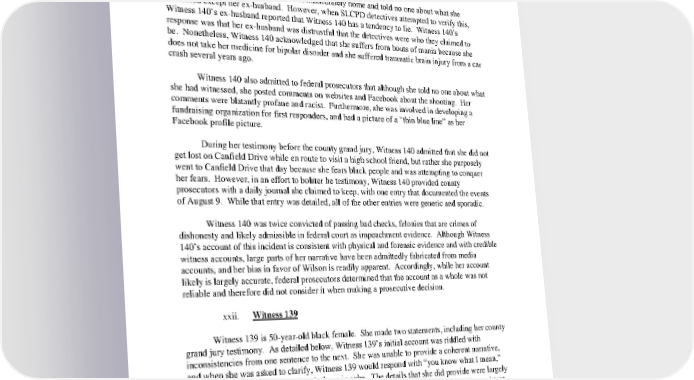 Investigators also questioned Witness 140 about the route she took out of the complex, which looks navigable on a map, but in reality is blocked by a concrete street barrier. Witness 140 responded that she is not good with directions, and was unsure the route she took. Since the shooting incident, she has acquired both a GPS and a mobile phone. Witness 140 stated that she went immediately home and told no one about what she witnessed except her exhusband. However, when SLCPD detectives attempted to verify this, Witness 140’s exhusband reported that Witness 140 has a tendency to lie. Witness 140’s response was that her exhusband was distrustful that the detectives were who they claimed to be. Nonetheless, Witness 140 acknowledged that she suffers from bouts of mania because she does not take her medicine for bipolar disorder and she suffered traumatic brain injury from a car crash several years ago. Witness 140 also admitted to federal prosecutors that although she told no one about what she had witnessed, she posted comments on websites and Facebook about the shooting. Her comments were blatantly profane and racist. Furthermore, she was involved in developing a fundraising organization for first responders, and had a picture of a “thin blue line” as her Facebook profile picture. During her testimony before the county grand jury, Witness 140 admitted that she did not get lost on Canfield Drive while en route to visit a high school friend, but rather she purposely went to Canfield Drive that day because she fears black people and was attempting to conquer her fears. However, in an effort to bolster he testimony, Witness 140 provided county prosecutors with a daily journal she claimed to keep, with one entry that documented the events of August 9. While that entry was detailed, all of the other entries were generic and sporadic. Witness 140 was twice convicted of passing bad checks, felonies that are crimes of dishonesty and likely admissible in federal court as impeachment evidence. Although Witness 140’s account of this incident is consistent with physical and forensic evidence and with credible witness accounts, large parts of her narrative have been admittedly fabricated from media accounts, and her bias in favor of Wilson is readily apparent. Accordingly, while her account likely is largely accurate, federal prosecutors determined that the account as a whole was not reliable and therefore did not consider it when making a prosecutive decision. xxii. Witness 139 Witness 139 is 50yearold black female. She made two statements, including her county grand jury testimony. As detailed below, Witness 139’s initial account was riddled with inconsistencies from one sentence to the next. She was unable to provide a coherent narrative, and when she was asked to clarify, Witness 139 would respond with “you know what I mean,” answer with a non sequitur, or break down in sobs. The details that she did provide were largely inconsistent with the physical evidence. Witness 139 was similarly incoherent and inconsistent when she testified before the county grand jury, unable to provide any sort of linear narrative. Witness 139 reluctantly came to the NAACP office in St. Louis to meet with SLCPD detectives, FBI agents, and federal prosecutors. Through hysterical tears, she expressed fear in 72