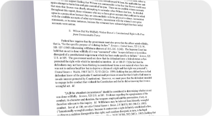 not establish that it was unreasonable for Wilson to perceive Brown as a threat while Brown was punching and grabbing him in the SUV and attempting to take his gun. Thereafter, when Brown started to flee, Wilson was aware that Brown had attempted to take his gun and suspected that Brown might have been part of a theft a few minutes before. Under the law, it was not unreasonable for Wilson to perceive that Brown posed a threat of serious physical harm, either to him or to others. When Brown turned around and moved toward Wilson, the applicable law and evidence do not support finding that Wilson was unreasonable in his fear that Brown would once again attempt to harm him and gain control of his gun. There are no credible witness accounts that state that Brown was clearly attempting to surrender when Wilson shot him. As detailed throughout this report, those witnesses who say so have given accounts that could not be relied upon in a prosecution because they are irreconcilable with the physical evidence, inconsistent with the credible accounts of other eyewitnesses, inconsistent with the witness’s own prior statements, or in some instances, because the witnesses have acknowledged that their initial accounts were untrue. ii. Wilson Did Not Willfully Violate Brown’s Constitutional Right to Be Free from Unreasonable Force Federal law requires that the government must also prove that the officer acted willfully, that is, “for the specific purpose of violating the law.” Screws v. United States, 325 U.S. 91, 101107 (1945) (discussing willfulness element of 18 U.S.C. § 242). The Supreme Court has held that an act is done willfully if it was “committed” either “in open defiance or in reckless disregard of a constitutional requirement which has been made specific or definite.” Screws, 325 U.S. at 105. The government need not show that the defendant knew a federal statute or law protected the right with which he intended to interfere. Id. at 10607 (“[t]he fact that the defendants may not have been thinking in constitutional terms is not material where their aim was not to enforce local law but to deprive a citizen of a right and that right was protected”); United States v. Walsh, 194 F.3d 37, 5253 (2d Cir. 1999) (holding that jury did not have to find defendant knew of the particular Constitutional provision at issue but that it had to find intent to invade interest protected by Constitution). However, we must prove that the defendant intended to engage in the conduct that violated the Constitution and that he did so knowing that it was a wrongful act. Id. “[A]ll the attendant circumstances” should be considered in determining whether an act was done willfully. Screws, 325 U.S. at 107. Evidence regarding the egregiousness of the conduct, its character and duration, the weapons employed and the provocation, if any, is therefore relevant to this inquiry. Id. Willfulness may be inferred from blatantly wrongful conduct. See id. at 106; see also United States v. Reese, 2 F.3d 870, 881 (9th Cir. 1993) (“Intentionally wrongful conduct, because it contravenes a right definitely established in law, evidences a reckless disregard for that right; such reckless disregard, in turn, is the legal equivalent of willfulness.”); United States v. Dise, 763 F.2d 586, 592 (3d Cir. 1985) (holding that when defendant “invades personal liberty of another, knowing that invasion is violation of state law, [defendant] has demonstrated bad faith and reckless disregard for [federal] constitutional rights”). Mistake, fear, misperception, or even poor judgment does not constitute willful conduct prosecutable under the statute. See United States v. McClean, 528 F.2d 1250, 1255 (2d Cir. 1976) (inadvertence or mistake negates willfulness for purposes of 18 U.S.C. § 242). 11