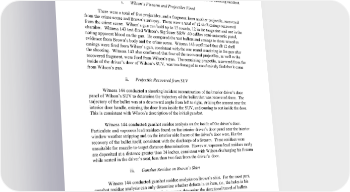 5. Ballistics Witness 143, a firearms and toolmarks examiner with the SLCPD, conducted the ballistics analysis for the St. Louis County Police Laboratory. Witness 144, an FBI firearms and toolmarks examiner, conducted gunshot residue analysis and reconstructed the shooting incident. i. Wilson’s Firearm and Projectiles Fired There were a total of five projectiles, and a fragment from another projectile, recovered from the crime scene and Brown’s autopsy. There were a total of 12 shell casings recovered from the crime scene. Wilson’s gun can hold up to 13 rounds, 12 in the magazine and one in the chamber. Witness 143 testfired Wilson’s Sig Sauer S&W .40 caliber semiautomatic pistol, noting apparent blood on the gun. He compared the test bullets and casings to those seized as evidence from Brown’s body and the crime scene. Witness 143 confirmed that all 12 shell casings were fired from Wilson’s gun, consistent with the one round remaining in the gun after the shooting. Witness 143 also confirmed that four of the recovered projectiles, as well as the recovered fragment, were fired from Wilson’s gun. The remaining projectile, recovered from the inside of the driver’s door of Wilson’s SUV, was too damaged to conclusively find that it came from Wilson’s gun. ii. Projectile Recovered from SUV Witness 144 conducted a shooting incident reconstruction of the interior driver’s door panel of Wilson’s SUV to determine the trajectory of the bullet that was recovered there. The trajectory of the bullet was at a downward angle from left to right, striking the armrest near the interior door handle, entering the door from inside the SUV, and coming to rest inside the door. This is consistent with Wilson’s description of the initial gunshot. Witness 144 conducted gunshot residue analysis on the inside of the driver’s door. Particulate and vaporous lead residues found on the interior driver’s door panel near the interior window weather stripping and on the interior side frame of the driver’s door were, like the recovery of the bullet itself, consistent with the discharge of a firearm. These residues were unsuitable for muzzletotarget distance determinations. However, vaporous lead residues rarely are deposited at a distance greater than 24 inches, consistent with Wilson discharging his firearm while seated in the driver’s seat, less than two feet from the driver’s door. iii. Gunshot Residue on Brown’s Shirt Witness 144 conducted gunshot residue analysis on Brown’s shirt. For the most part, gunshot residue analysis can only determine whether defects in an item, i.e., the holes in his shirt, are the result of gunshots. Analysis cannot determine the directional travel of bullets. Witness 144 examined seven holes in the shirt. Gunshot residues in the form of nitrite and bullet wipe lead residues were found near some of the holes. This does not necessarily suggest that the remaining holes were not created by bullets. According to Witness 144, lack of 23