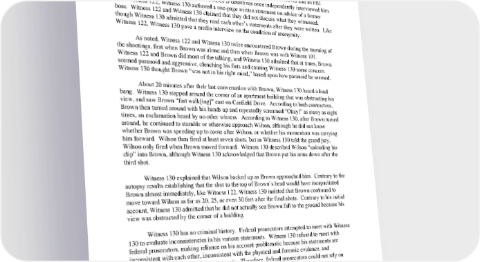 xiii. Witness 130 Witness 130 is a 26–yearold white male. As previously noted, he was laying drain pipe on Canfield Drive with Witness 122, on the morning of the shooting. Witness 130 gave five statements, including testimony before the county grand jury. SLCPD detectives and an FBI agent twice jointly interviewed him, and SLCPD detectives once independently interviewed him. Like Witness 122, Witness 130 authored a onepage written statement on advice of a former boss. Witness 122 and Witness 130 claimed that they did not discuss what they witnessed, though Witness 130 admitted that they read each other’s statements after they were written. Like Witness 122, Witness 130 gave a media interview on the condition of anonymity. As noted, Witness 122 and Witness 130 twice encountered Brown during the morning of the shootings, first when Brown was alone and then when Brown was with Witness 101. Witness 122 and Brown did most of the talking, and Witness 130 admitted that at times, Brown seemed paranoid and aggressive, clenching his fists and causing Witness 130 some concern. Witness 130 thought Brown “was not in his right mind,” based upon how paranoid he seemed. About 20 minutes after their last conversation with Brown, Witness 130 heard a loud bang. Witness 130 stepped around the corner of an apartment building that was obstructing his view, and saw Brown “fast walk[ing]” east on Canfield Drive. According to both contractors, Brown then turned around with his hands up and repeatedly screamed “Okay!” as many as eight times, an exclamation heard by no other witness According to Witness 130, after Brown turned around, he continued to stumble or otherwise approach Wilson, although he did not know whether Brown was speeding up to come after Wilson, or whether his momentum was carrying him forward. Wilson then fired at least seven shots, but as Witness 130 told the grand jury, Wilson only fired when Brown moved forward. Witness 130 described Wilson “unloading his clip” into Brown, although Witness 130 acknowledged that Brown put his arms down after the third shot. Witness 130 explained that Wilson backed up as Brown approached him. Contrary to the autopsy results establishing that the shot to the top of Brown’s head would have incapacitated Brown almost immediately, like Witness 122, Witness 130 insisted that Brown continued to move toward Wilson as far as 20, 25, or even 30 feet after the final shots. Contrary to his initial account, Witness 130 admitted that he did not actually see Brown fall to the ground because his view was obstructed by the corner of a building. Witness 130 has no criminal history. Federal prosecutors attempted to meet with Witness 130 to evaluate inconsistencies in his various statements. Witness 130 refused to meet with federal prosecutors, making reliance on his account problematic because his statements are inconsistent with each other, inconsistent with the physical and forensic evidence, and inconsistent with credible witness accounts. Therefore, federal prosecutors could not rely on Witness 130’s account to support a prosecution of Darren Wilson. xiv. Witness 142 Witness 142 is a 48yearold black male. Witness 142 briefly spoke to SLCPD detectives within hours of the shooting incident and denied that he witnessed the shooting. However, the 60