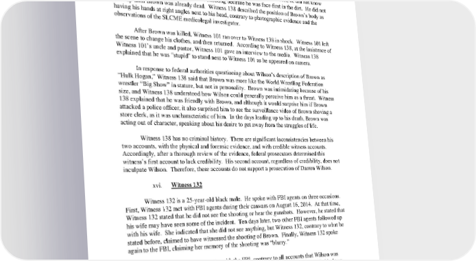 Witness 138 told federal authorities that Brown fell to the ground in the exact place where he first turned around and did not move forward toward Wilson. Because this is inconsistent with the physical evidence and other credible accounts, federal authorities asked Witness 138 if it was possible that Brown moved toward Wilson. Witness 138 explained that Brown could have moved forward, could have put his arms down, and in fact, he did not know what Brown did for the majority of the shooting because he was facefirst in the dirt. He did not look up until Brown was already dead. Witness 138 described the position of Brown’s body as having his hands at right angles next to his head, contrary to photographic evidence and the observations of the SLCME medicolegal investigator. After Brown was killed, Witness 101 ran over to Witness 138 in shock. Witness 101 left the scene to change his clothes, and then returned. According to Witness 138, at the insistence of Witness 101’s uncle and pastor, Witness 101 gave an interview to the media. Witness 138 explained that he was “stupid” to stand next to Witness 101 as he appeared on camera. In response to federal authorities questioning about Wilson’s description of Brown as “Hulk Hogan,” Witness 138 said that Brown was more like the World Wrestling Federation wrestler “Big Show” in stature, but not in personality. Brown was intimidating because of his size, and Witness 138 understood how Wilson could generally perceive him as a threat. Witness 138 explained that he was friendly with Brown, and although it would surprise him if Brown attacked a police officer, it also surprised him to see the surveillance video of Brown shoving a store clerk, as it was uncharacteristic of him. In the days leading up to his death, Brown was acting out of character, speaking about his desire to get away from the struggles of life. Witness 138 has no criminal history. There are significant inconsistencies between his two accounts, with the physical and forensic evidence, and with credible witness accounts. Accordingly, after a thorough review of the evidence, federal prosecutors determined this witness’s first account to lack credibility. His second account, regardless of credibility, does not inculpate Wilson. Therefore, these accounts do not support a prosecution of Darren Wilson. xvi. Witness 132 Witness 132 is a 25yearold black male. He spoke with FBI agents on three occasions. First, Witness 132 met with FBI agents during their canvass on August 16, 2014. At that time, Witness 132 stated that he did not see the shooting or hear the gunshots. However, he stated that his wife may have seen some of the incident. Ten days later, two other FBI agents followed up with his wife. She indicated that she did not see anything, but Witness 132, contrary to what he stated before, claimed to have witnessed the shooting of Brown. Finally, Witness 132 spoke again to the FBI, claiming her memory of the shooting was “blurry.” During her second encounter with the FBI, contrary to all accounts that Wilson was driving westbound, Witness 132 said that he, Witness 132, was driving eastbound behind two FPD marked SUVs. Each SUV had two police officers, all of whom were white. According to Witness 132, the first SUV stopped in the middle of the street, cutting off Brown and running over his feet. Brown then “punched into the police car” because he was angry. In return, the police officer, to whom Witness 132 referred as “Ears,” reached down and shot Brown. Witness 63