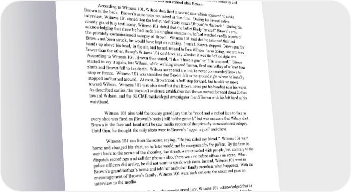 that his back was to both Brown and Wilson. Fearing for his life, Witness 101 crouched down among the cars that had now stopped in the middle of the street because of the parked SUV. Witness 101 attempted to get into a nearby car, a gray Sunfire, but the occupants would not allow him inside. Brown ran past Witness 101, telling him, “Keep running, bro.” After a pause, Witness 101 explained that he heard Wilson emerge from the SUV. Witness 101 stood up and watched “in plain sight” as Wilson passed him and chased after Brown. According to Witness 101, Wilson then fired a second shot which appeared to strike Brown in the back. Brown’s arms were not raised at that time. During his investigative interview, Witness 101 stated that the bullet “definitely struck [Brown] in the back.” During his county grand jury testimony, Witness 101 stated that the bullet likely “grazed” Brown’s arm, acknowledging that since he had made his original statements, he had watched media reports of the privatelycommissioned autopsy of Brown. Witness 101 said that he assumed that had Brown not been struck, he would have kept on running. Instead, Brown stopped. Brown put his hands up above his head, in the air, and turned around to face Wilson. In so doing, one arm was lower than the other, though Witness 101 could not say whether it was the left or right arm. According to Witness 101, Brown then stated, “I don’t have a gun” or “I’m unarmed.” Brown started to say it again, but Wilson, while walking toward Brown, fired one volley of at least four shots and Brown fell to his death. Wilson never said a word; he never commanded Brown to stop or freeze. Witness 101 was steadfast that Brown fell to the ground right where he initially stopped and turned around. At most, Brown took a halfstep forward, but he did not move toward Wilson. Witness 101 was also steadfast that Brown never put his hand(s) near his waist. As described earlier, the physical evidence establishes that Brown moved forward about 20 feet toward Wilson, and the SLCME medicolegal investigator found Brown with his left hand at his waistband. Witness 101 also told the county grand jury that he “stood and watched facetoface as every shot was fired as [Brown]’s body [fell] to the ground,” but was unaware that Wilson shot Brown in the face and head until he saw media reports of the privatelycommissioned autopsy. Until then, he thought the only shots were to Brown’s “upper region” and chest. Witness 101 ran from the scene, saying, “He just killed my friend.” Witness 101 went home and changed his shirt, so he later would not be recognized by the police. By the time he went back to the scene of the shooting, the streets were crowded with people, but, contrary to the dispatch recordings and cellular phone video, there were no police officers on scene. When police officers did arrive, he did not want to speak with them. Instead, Witness 101 went to Brown’s grandmother’s home and told her and other family members what happened. With the encouragement of Brown’s family, Witness 101 went back out onto the street and gave an interview to the media. During his testimony before the county grand jury, Witness 101 acknowledged that he had discussed the incident with another witness, Witness 118. Witness 101 explained that he was friendly with Witness 118, and noticed her standing on her balcony when he and Brown first encountered Wilson on Canfield Drive. He explained that he was surprised that so many other witnesses came forward because Witness 118 was the only person he saw outside, and she was the only person who saw the incident from the “first shot to the last shot.” However, as detailed 46