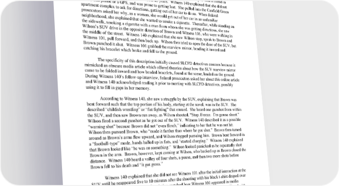 investigators to question her veracity. Therefore, federal prosecutors and agents conducted a followup interview. During her followup interview, as in her initial account, Witness 140 claimed that she inadvertently ended up on Canfield Drive because she got lost on her way to visit a friend in Florissant, whom she had not seen in about 25 years. Witness 140 explained that she did not have a cell phone or a GPS, and was prone to getting lost. She pulled into the Canfield Green apartment complex to ask for directions, getting out of her car to do so. When federal prosecutors asked her why, as a woman, she would get out of her car in an unfamiliar neighborhood, she explained that she wanted to smoke a cigarette. Thereafter, while standing on the sidewalk, smoking a cigarette with a man from whom she was getting directions, she saw Wilson’s SUV drive in the opposite direction of Brown and Witness 101, who were walking in the middle of the street. Witness 140 explained that she saw Wilson stop, speak to Brown and Witness 101, pull forward, and then back up. Wilson then tried to open the door of the SUV, but Brown punched it shut. Witness 101 grabbed the rearview mirror, bending it inward and catching his bracelet which broke and fell to the ground. The specificity of this description initially caused SLCPD detectives concern because it mimicked an obscure media article which offered theories about how the SUV rearview mirror came to be folded inward and how beaded bracelets, found at the scene, landed on the ground. During Witness 140’s followup interview, federal prosecutors asked her about this online article and Witness 140 acknowledged reading it prior to meeting with SLCPD detectives, possibly using it to fill in gaps in her memory. According to Witness 140, she saw a struggle by the SUV, explaining that Brown was bent forward such that the top portion of his body, starting at the navel, was in the SUV. She described “childish wrestling” or “fist fighting” that ensued. She heard one gunshot from within the SUV, and then saw Brown run away, as Wilson shouted, “Stop. Freeze. I’m gonna shoot.” Wilson fired a second gunshot as he got out of the SUV. Witness 140 described it as a possible “warning shot” because Brown did not “even flinch,” indicating to her that he was not hit. Wilson then pursued Brown, who “made it further than where he got shot.” Brown then turned around as Brown’s arms flew upward, and Wilson stopped pursuing him. Brown bent forward in a “footballtype” mode, hands balled up in fists, and “started charging.” Witness 140 explained that Brown looked like “he was on something.” Wilson looked panicked as he repeatedly shot Brown in the arm. Brown, however, kept coming at Wilson, who backed up as Brown closed the distance. Witness 140 heard a volley of four shots, a pause, and then two more shots before Brown fell to his death and “it got gross.” Witness 140 explained that she did not see Witness 101 after the initial interaction at the SUV until he reappeared five to 10 minutes after the shooting with his black tshirt draped over his “wifebeater” tank top. This description matched how Witness 101 appeared in media interviews in the aftermath of the shooting. Also, seeing Witness 101 reappear conflicted with Witness 140’s explanation that she immediately left Canfield Drive after the last shots because she was the only white woman in a neighborhood that was quickly growing hostile. 71