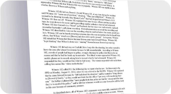 Brown made some type of movement similar to pulling his pants up or a shoulder shrug, and then “charged” at Wilson. It was only then that Wilson fired five or six shots at Brown. Brown paused and appeared to flinch, and Wilson stopped firing. However, Brown charged at Wilson again, and again Wilson fired about three or four rounds until Brown finally collapsed on the ground. Witness 102 was in disbelief that Wilson seemingly kept missing because Brown kept advancing forward. Witness 102 described Brown as a “threat,” moving at a “full charge.” Witness 102 stated that Wilson only fired shots when Brown was coming toward Wilson. It appeared to Witness 102 that Wilson’s life was in jeopardy. Witness 102 was unable to hear whether Brown or Wilson said anything. Witness 102 did not see Brown’s friend, Witness 101, at any time during the incident until Witness 101 “came out of nowhere,” shouting, “‘They just killed him!’” Witness 101 23 seemed to be shouting toward a blue Monte Carlo that had stopped behind Wilson’s SUV. Witness 101 then ran off. Witness 102 explained that once he saw officers putting up police tape, he went down to the scene and began telling another onlooker what he had witnessed. Witness 102 later learned via a “friend” on Facebook that his voice was inadvertently captured on another bystander’s cell phone recording. Federal prosecutors reviewed this recording and Witness 102 identified his voice on the recording when he testified before the county grand jury. In it, Witness 102 can be heard correcting someone else who was recounting what he heard from others, that Wilson “stood over [Brown] and shot while on the ground.” In response, Witness 102 stated that Wilson shot Brown because Brown came back toward Wilson. Witness 102 “kept thinking” that Wilson’s shots were “missing” Brown because Brown kept moving. Witness 102 did not stay on Canfield Drive long after the shooting, but rather started to leave the area after about five minutes because he felt uncomfortable. According to Witness 102, crowds of people had begun to gather, wrongly claiming the police shot Brown for no reason and that he had his hands up in surrender. Two black women approached Witness 102, mobile phones set to record, asking him to recount what he had witnessed. Witness 102 responded that they would not like what he had to say. The women responded with racial slurs, calling him names like “white motherfucker.” Witness 102 called 911 the following day to report what he saw. He then went to the FPD on Monday, August 11, 2014, where he was referred to the SLCPD. Witness 102 explained that he came forward because he “felt bad about the situation,” and he wanted to “bring closure to [Brown’s] family,” so they would not think that the officer “got away with murdering their son.” He further explained that “most people think that police are bad for ‘em up until the time they’re in need of the police,” and he felt that witnesses would not come forward to tell the truth in this case because of community pressure. As described above, all of Witness 102’s statements were materially consistent with each other, with physical and forensic evidence, and with other credible witness accounts. Witness 102 does not have a criminal history. Therefore, if called as a defense witness in a prosecution of Darren Wilson, this witness’s account would not be vulnerable to meaningful cross examination and would not be subject to impeachment due to bias or inconsistencies in his prior statements. Accordingly, after a thorough review of all the evidence, federal prosecutors 23 As detailed below, the Monte Carlo in question was white. 28
