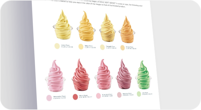 DOLE SOFT SERVE® Brand Standards This Brand Guideline is for the U.S. Only ® DOLE SOFT SERVE COLOR SPECIFICATIONS In order to maintain color consistency when showing images of DOLE SOFT SERVE® in cones or cups, the following color guide has been created to help you match the color of the images to that of the finished product. Lemon Flavor Mango Flavor Pineapple Flavor Orange Flavor C 4, M 4, Y 27, K 0 C 2, M 7, Y 37, K 0 C 4, M 5, Y 28, K 0 C 4, M 13, Y 38, K 0 Watermelon Flavor Cherry Flavor Strawberry Flavor Raspberry Flavor Lime Flavor C 4, M 22, Y 3, K 0 C 13, M 71, Y 53, K 1 C 2, M 26, Y 7, K 0 C 8, M 25, Y 13, K 0 C 18, M 0, Y 32, K 0 -9-