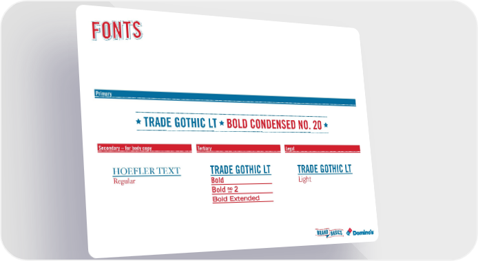 Domino's Brand Book Page 8 Primary TRADE GOTHIC LT BOLD CONDENSED NO. 20 Secondary – for body copy Tertiary Legal HOEFLER TEXT TRADE GOTHIC LT TRADE GOTHIC LT Regular Bold Light no Bold 2 – Bold Extended