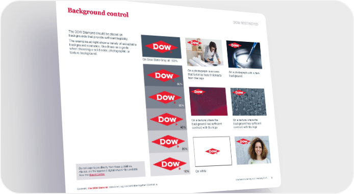 Background control DOW RESTRICTED The DOW Diamond should be placed on backgrounds that provide sufficient legibility. The examples at right show a variety of acceptable background scenarios. Use these as a guide when choosing a solid color, photographic or texture background. On Dow Slate Gray at 100% On a photograph in an area On a photograph with a dark that is not so busy it detracts background from the logo 80% 60% On a texture where the On a texture where the background has sufficient background has sufficient 40% contrast with the logo contrast with the logo 20% Do not copy logos directly from these guidelines. Always use the approved digital artwork files available from the Brand Center. 10% On white Contents | The DOW Diamond | Brandline | Logo and brandline together | Contact us Dow brand summary v2.2 | February 2021 6
