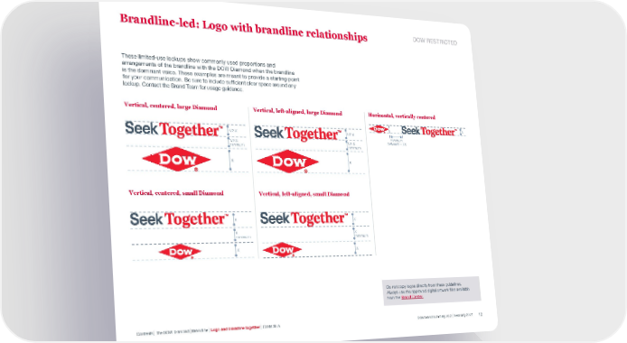 Brandline-led: Logo with brandline relationships DOW RESTRICTED These limited-use lockups show commonly used proportions and arrangements of the brandline with the DOW Diamond when the brandline is the dominant voice. These examples are meant to provide a starting point for your communication. Be sure to include sufficient clear space around any lockup. Contact the Brand Team for usage guidance. Vertical, centered, large Diamond Vertical, left-aligned, large Diamond Horizontal, vertically centered X 1/2 X 1/2 X minimum 1/2 X 1/2 X between = 2X minimum minimum X X Vertical, centered, small Diamond Vertical, left-aligned, small Diamond X X X X minimum minimum X X Do not copy logos directly from these guidelines. Always use the approved digital artwork files available from the Brand Center. Contents | The DOW Diamond | Brandline | Logo and brandline together | Contact us Dow brand summary v2.2 | February 2021 12