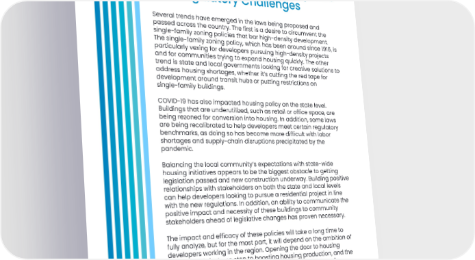 Comparative Analysis Repurposing Underutilized Spaces and Regulatory Challenges Several trends have emerged in the laws being proposed and passed across the country. The first is a desire to circumvent the single-family zoning policies that bar high-density development. The single-family zoning policy, which has been around since 1916, is particularly vexing for developers pursuing high-density projects and for communities trying to expand housing quickly. The other trend is state and local governments looking for creative solutions to address housing shortages, whether it’s cutting the red tape for development around transit hubs or putting restrictions on single-family buildings. COVID-19 has also impacted housing policy on the state level. Buildings that are underutilized, such as retail or office space, are being rezoned for conversion into housing. In addition, some laws are being recalibrated to help developers meet certain regulatory benchmarks, as doing so has become more difficult with labor shortages and supply-chain disruptions precipitated by the pandemic. Balancing the local community’s expectations with state-wide housing initiatives appears to be the biggest obstacle to getting legislation passed and new construction underway. Building positive relationships with stakeholders on both the state and local levels can help developers looking to pursue a residential project in line with the new regulations. In addition, an ability to communicate the positive impact and necessity of these buildings to community stakeholders ahead of legislative changes has proven necessary. The impact and efficacy of these policies will take a long time to fully analyze, but for the most part, it will depend on the ambition of developers working in the region. Opening the door to housing production is just one step to boosting housing production, and the success will depend on how many firms have the vision and ambition to rise to the occasion. Zoning and regulatory changes are a step toward addressing housing shortages, but the building and construction process for major residential projects is complex. At the end of the day, it’s the developers who need to take advantage of these regulatory changes, and the legislative action is designed to facilitate this kind of business in individual states. 21