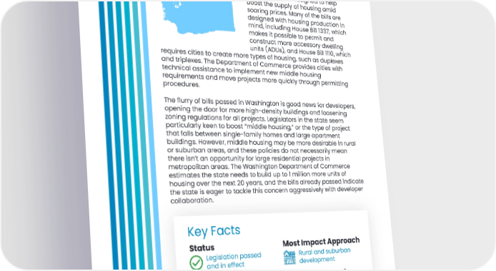 Washington Governor Jay Inslee passed 10 housing bills into law in May of 2023, with much of the legislature designed to help boost the supply of housing amid soaring prices. Many of the bills are designed with housing production in mind, including House Bill 1337, which makes it possible to permit and construct more accessory dwelling units (ADUs), and House Bill 1110, which requires cities to create more types of housing, such as duplexes and triplexes. The Department of Commerce provides cities with technical assistance to implement new middle housing requirements and move projects more quickly through permitting procedures. The flurry of bills passed in Washington is good news for developers, opening the door for more high-density buildings and loosening zoning regulations for all projects. Legislators in the state seem particularly keen to boost “middle housing,” or the type of project that falls between single-family homes and large apartment buildings. However, middle housing may be more desirable in rural or suburban areas, and these policies do not necessarily mean there isn’t an opportunity for large residential projects in metropolitan areas. The Washington Department of Commerce estimates the state needs to build up to 1 million more units of housing over the next 20 years, and the bills already passed indicate the state is eager to tackle this concern aggressively with developer collaboration. Key Facts Status Most Impact Approach Legislation passed Rural and suburban and in effect development Avg. House Price 2023 Population Growth From 2010-2020 $563,000 up 14.6% or 980,741 people 18