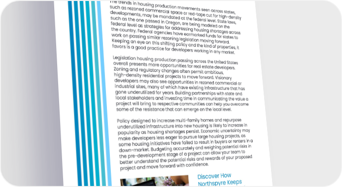 Conclusion Navigating the Future The trends in housing production movements seen across states, such as rezoned commercial space or red-tape cut for high-density developments, may be mandated at the federal level. State laws, such as the one passed in Oregon, are being modeled on the federal level as strategies for addressing housing shortages across the country. Federal agencies have earmarked funds for states to work on passing similar rezoning legislation moving forward. Keeping an eye on this shifting policy and the kind of properties, it favors is a good practice for developers working in any market. Legislation housing production passing across the United States overall presents more opportunities for real estate developers. Zoning and regulatory changes often permit ambitious, high-density residential projects to move forward. Visionary developers may also see opportunities in rezoned commercial or industrial sites, many of which have existing infrastructure that has gone underutilized for years. Building partnerships with state and local stakeholders and investing time in communicating the value a project will bring to respective communities can help you overcome some of the resistance that can emerge on the local level. Policy designed to increase multi-family homes and repurpose underutilized infrastructure into new housing is likely to increase in popularity as housing shortages persist. Economic uncertainty may make developers less eager to pursue large housing projects, as some housing initiatives have failed to result in buyers or renters in a down-market. Budgeting accurately and weighing potential risks in the pre-development stage of a project can allow your team to better understand the potential risks and rewards of your proposed project and move forward with confidence. Discover How Northspyre Keeps Budgets On Track from Pre-Development to Stabilization Book a Demo 24