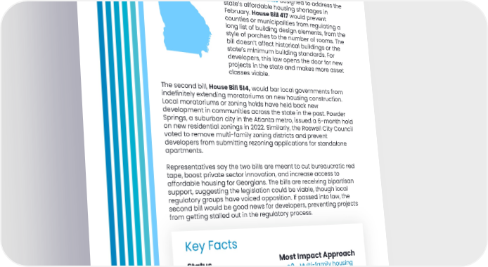 Looking Ahead Georgia Georgia lawmaker Dale Washburn introduced two bills designed to address the state’s affordable housing shortages in February. House Bill 417 would prevent counties or municipalities from regulating a long list of building design elements, from the style of porches to the number of rooms. The bill doesn’t affect historical buildings or the state’s minimum building standards. For developers, this law opens the door for new projects in the state and makes more asset classes viable. The second bill, House Bill 514, would bar local governments from indefinitely extending moratoriums on new housing construction. Local moratoriums or zoning holds have held back new development in communities across the state in the past. Powder Springs, a suburban city in the Atlanta metro, issued a 6-month hold on new residential zonings in 2022. Similarly, the Roswell City Council voted to remove multi-family zoning districts and prevent developers from submitting rezoning applications for standalone apartments. Representatives say the two bills are meant to cut bureaucratic red tape, boost private sector innovation, and increase access to affordable housing for Georgians. The bills are receiving bipartisan support, suggesting the legislation could be viable, though local regulatory groups have voiced opposition. If passed into law, the second bill would be good news for developers, preventing projects from getting stalled out in the regulatory process. Key Facts Status Most Impact Approach Legislation in debate Multi-family housing throughout the state Avg. House Price 2023 Population Growth From 2010-2020 $306,000 up 10.6% or 1,024,255 people 19