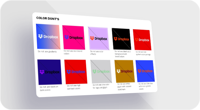 COLOR DONT’S Do not use black as a Do not use non Do not use non brand Do not use color Do not use gradients background with system color pairings colors effects brand colors Do not use white Do not use high Do not use one color Do not use DBX blue Do not use black on glyph with colored contrast colors for logo and glyph with non-system dark colors wordmark colors