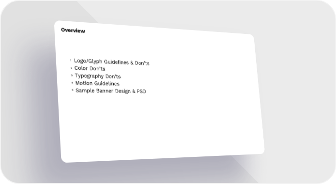 Overview 1 Logo/Glyph Guidelines & Don’ts 2 Color Don’ts 3 Typography Don’ts 4 Motion Guidelines 5 Sample Banner Design & PSD