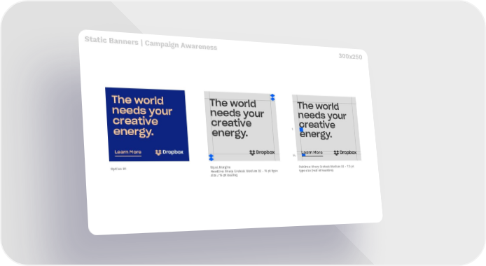Dropbox Brand Book Page 21 Page 23Static Banners | Campaign Awareness 300x250 1 ½ Equal Margins Sublines: Sharp Grotesk Medium 22 - 7.5 pt Option 01 Headline: Sharp Grotesk Medium 22 - 15 pt type type size (half of headline) size / 15 pt leading