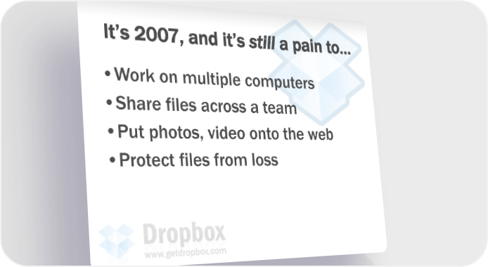 Dropbox Valuation at IPO $12.6B Page 2 Page 4It’s 2007, and it’s still a pain to… •Work on multiple computers •Share files across a team •Put photos, video onto the web •Protect files from loss