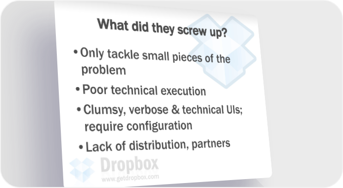 Dropbox Valuation at IPO $12.6B Page 10 Page 12What did they screw up? •Only tackle small pieces of the problem •Poor technical execution •Clumsy, verbose & technical UIs; require configuration •Lack of distribution, partners