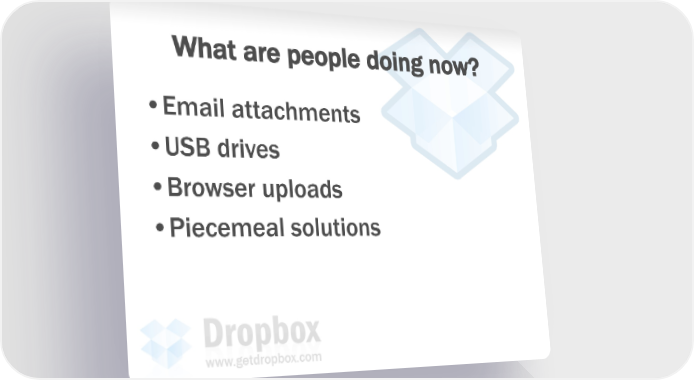 Dropbox Valuation at IPO $12.6B Page 3 Page 5What are people doing now? •Email attachments •USB drives •Browser uploads •Piecemeal solutions